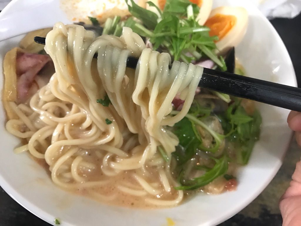 しかし、もう一杯オーダーしてたのは、旨辛味噌麺、このラーメンの辛味はラー油の強さが前面に出ていて、貝汁ベース(ベースは貝汁なのか店主に聞いた)も弱い。