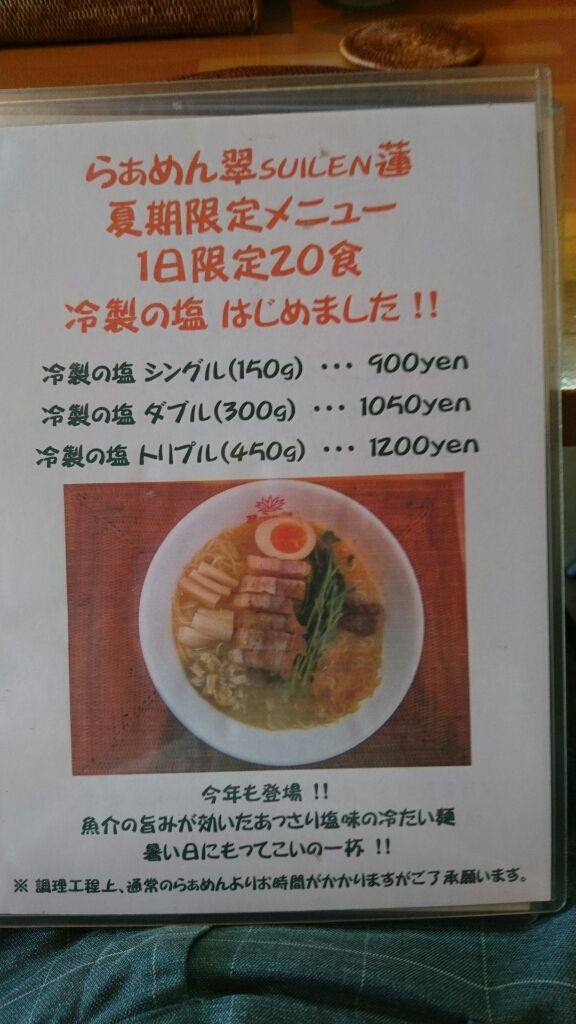 塩、醤油、味噌、冷やし、まぜと悩みに悩んで『冷製の塩 シングル 900円』を注文。