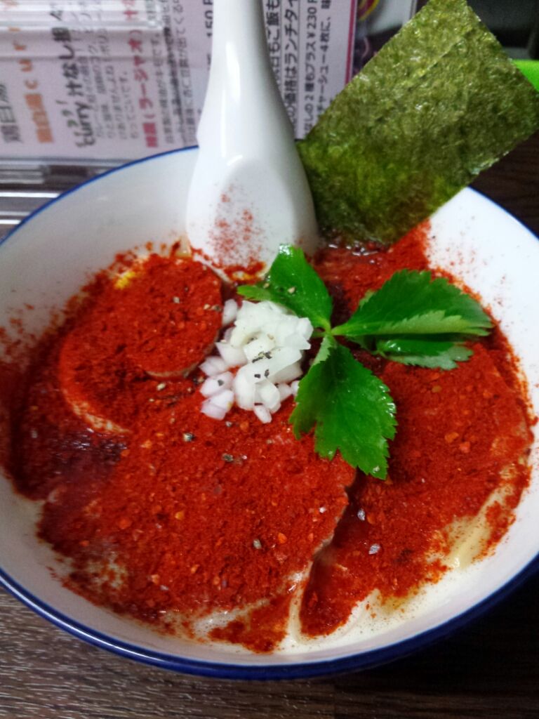 真っ赤に染まった丼を見たときは、引きましたが、食してみると、辛さよりも、旨さが強い感じ。そのような唐辛子を使っているようです。