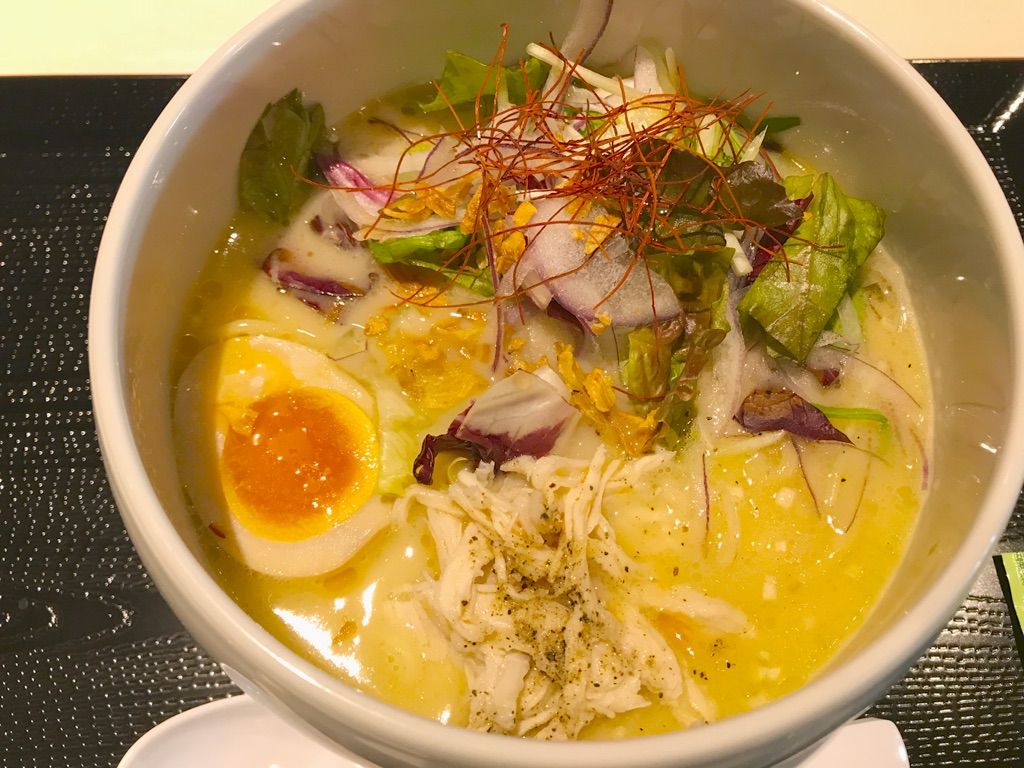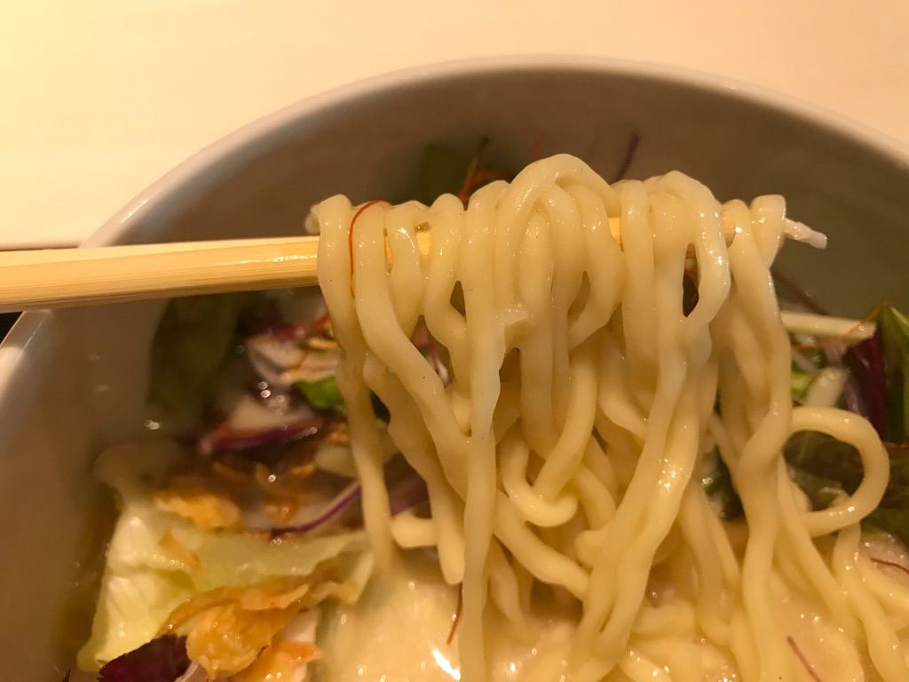 鶏白湯スープは臭みもなくまろやかな感じで、麺はやや太めのもっちりした縮れ麺。