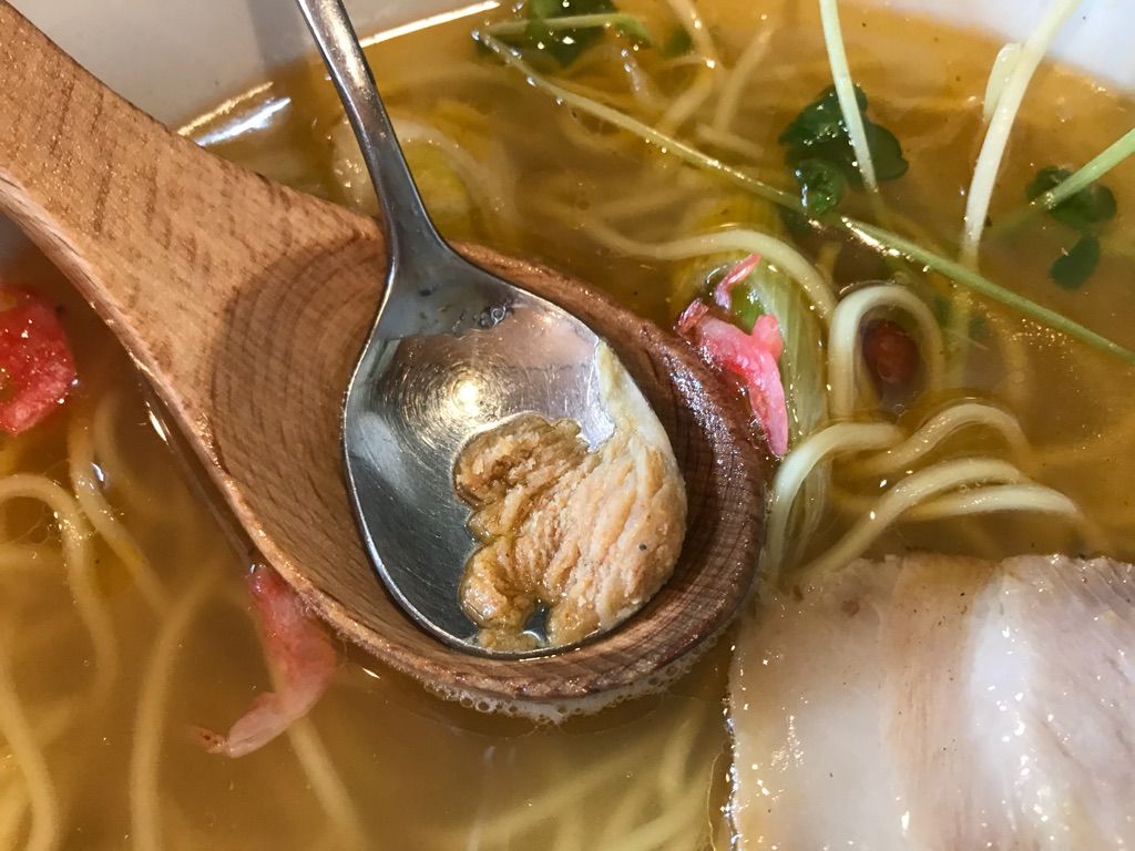 塩ラーメンを食べている途中、スプーンで味変の海老バターをスプーンでくれます。入れるとまろやかな感じに味変。