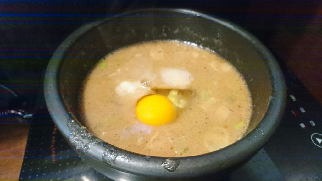 無料のご飯と卵をつけ汁に入れて、電気コンロで温めます。