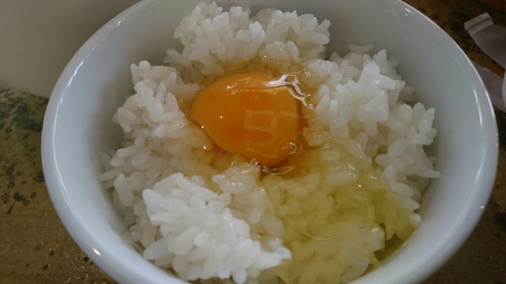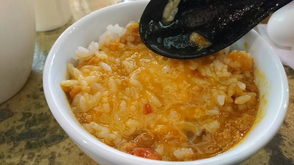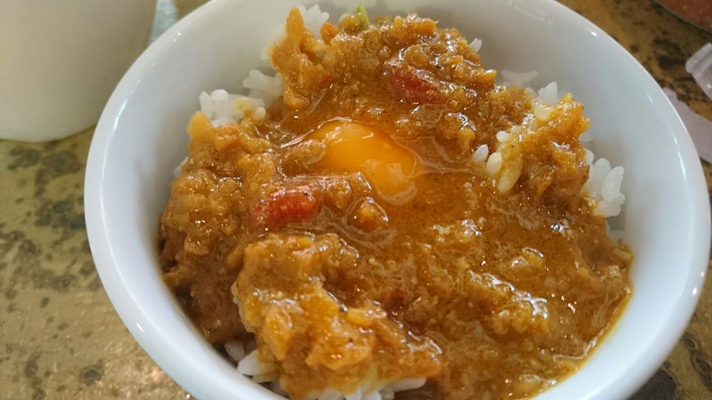 ここからは無料の生卵をご飯に割って、残りの海老カリーをぶっかけます!