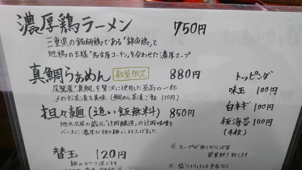 三重県の銘柄鶏「錦爽鶏」と「名古屋コーチン」を合わせたスープとのこと。