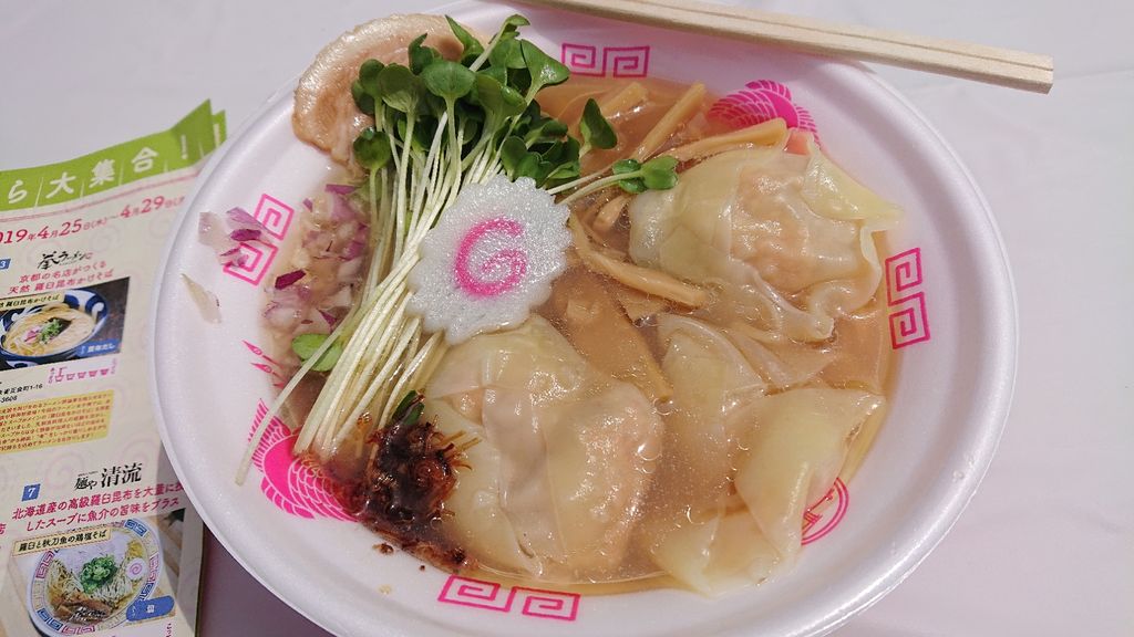 透き通ったスープに、中細麺、豚バラチャーシュー、かいわれ大根、シナチク、レッドオニオンのみじん切り、揚げネギが乗っています。そこに今回のラーメン博限定の桜エビのとりワンタンを追加TPで。