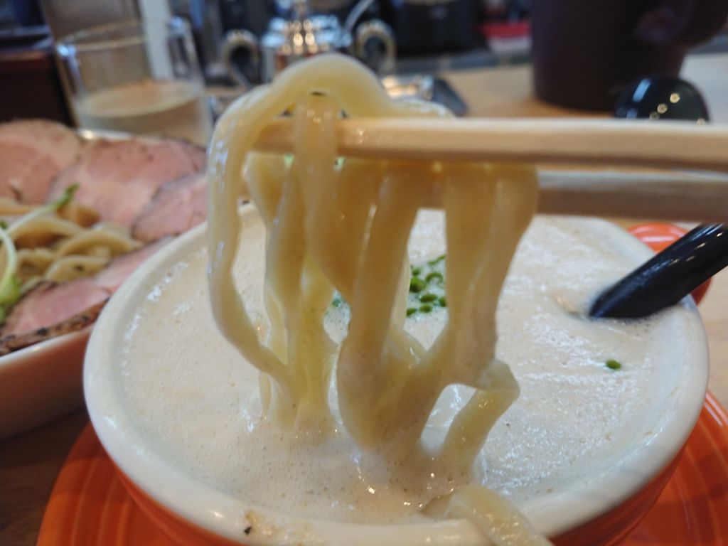中太平打ちの自家製麺をそのまますすりつつ、濃厚な塩とんこつ魚介のつけ汁に半どぼーん!とつけて、更にすすります。