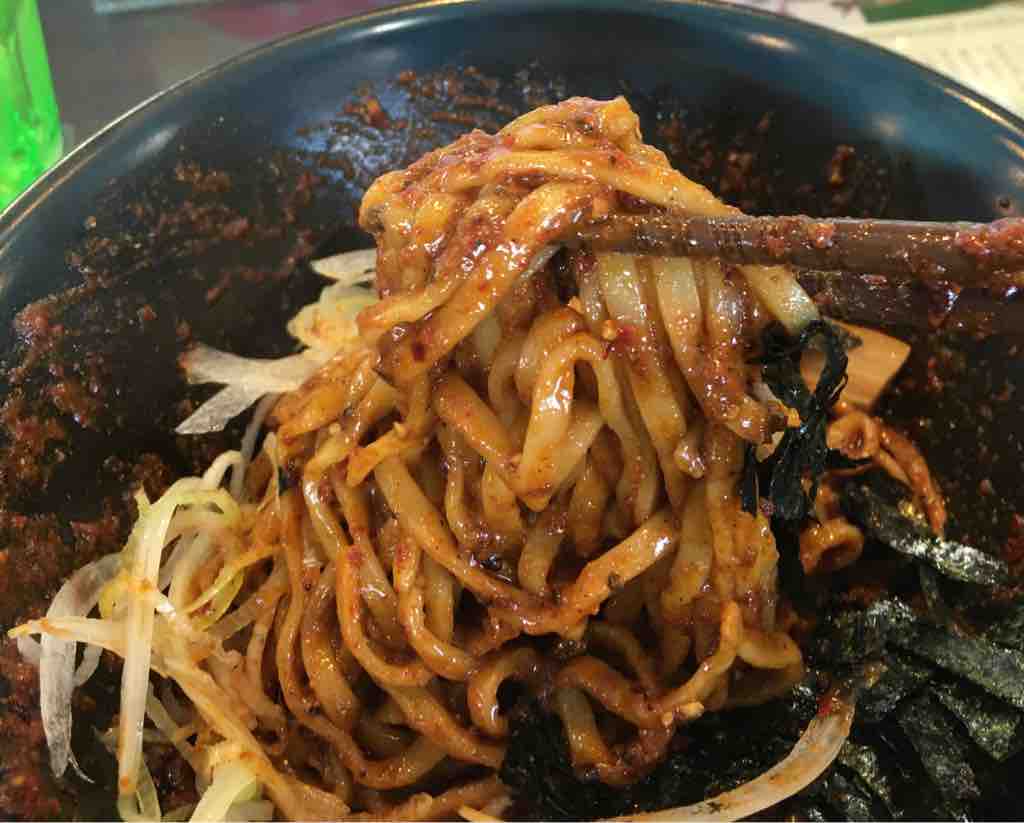 満遍なく麺とタレ絡み合わせ食べます!