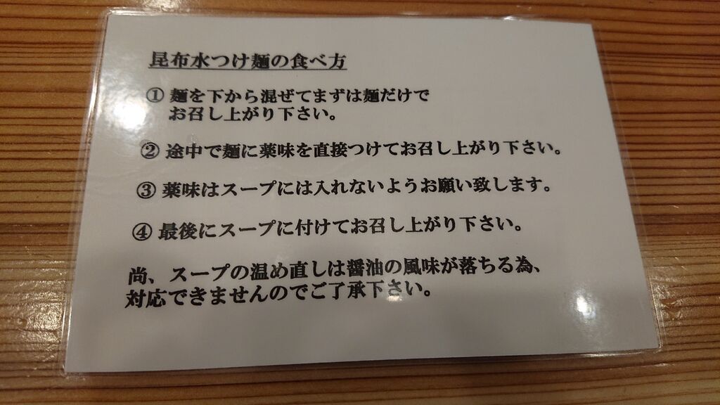 着席すると、昆布水つけ麺の食べ方を渡されました。