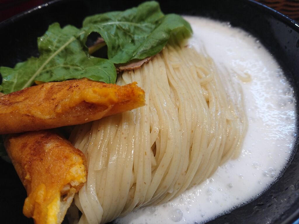 『ポルチーニ茸のつけ麺 ~カボチャの春巻を添えて~ 1100円』です。