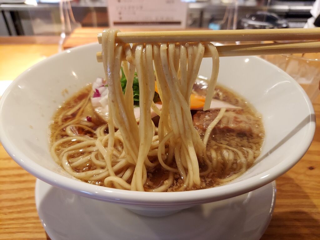 麺をリフトして見ると見るからに低加水ですが、啜ると今までに食べたことの無いような、低加水のモチ麺。