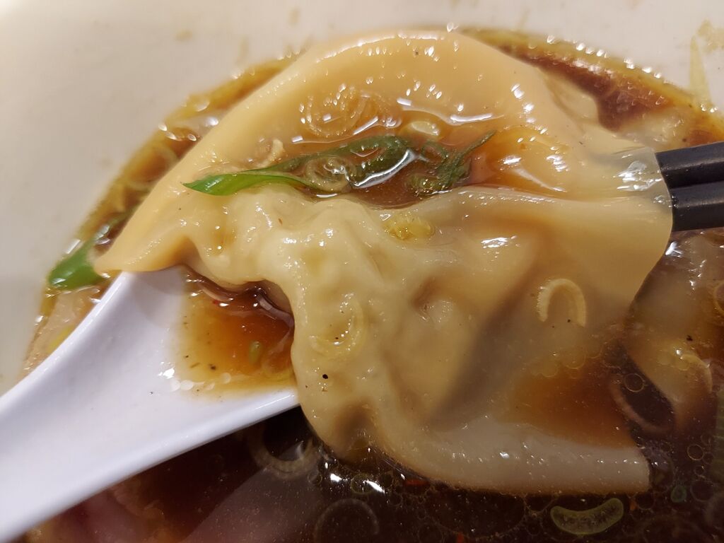 楽しみのワンタンは辛めのつけ汁に浸かっててちと味わいにくいけどペロンペロンで思わず一口ですすってしまいましたわ!