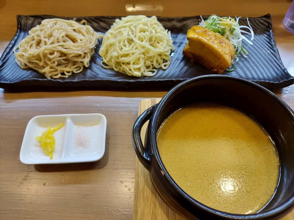 中盤から塩のせいなのか、味噌つけ汁の塩味が強く感じはじめ、流石に合盛り二玉のボリュームとトロトロ角煮のボリュームに腹パンパン!!