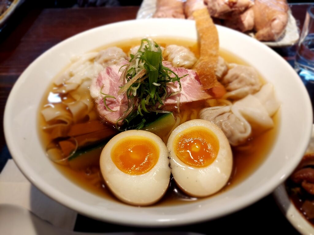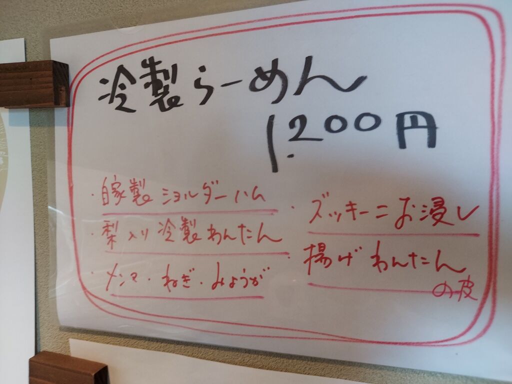 本日は『冷製らーめん 1200円』『梨入りわんたん増し増し 400円』と『くんたま 100円』『スタミナ肝しぐれ 300円』の2000円ジャストです!