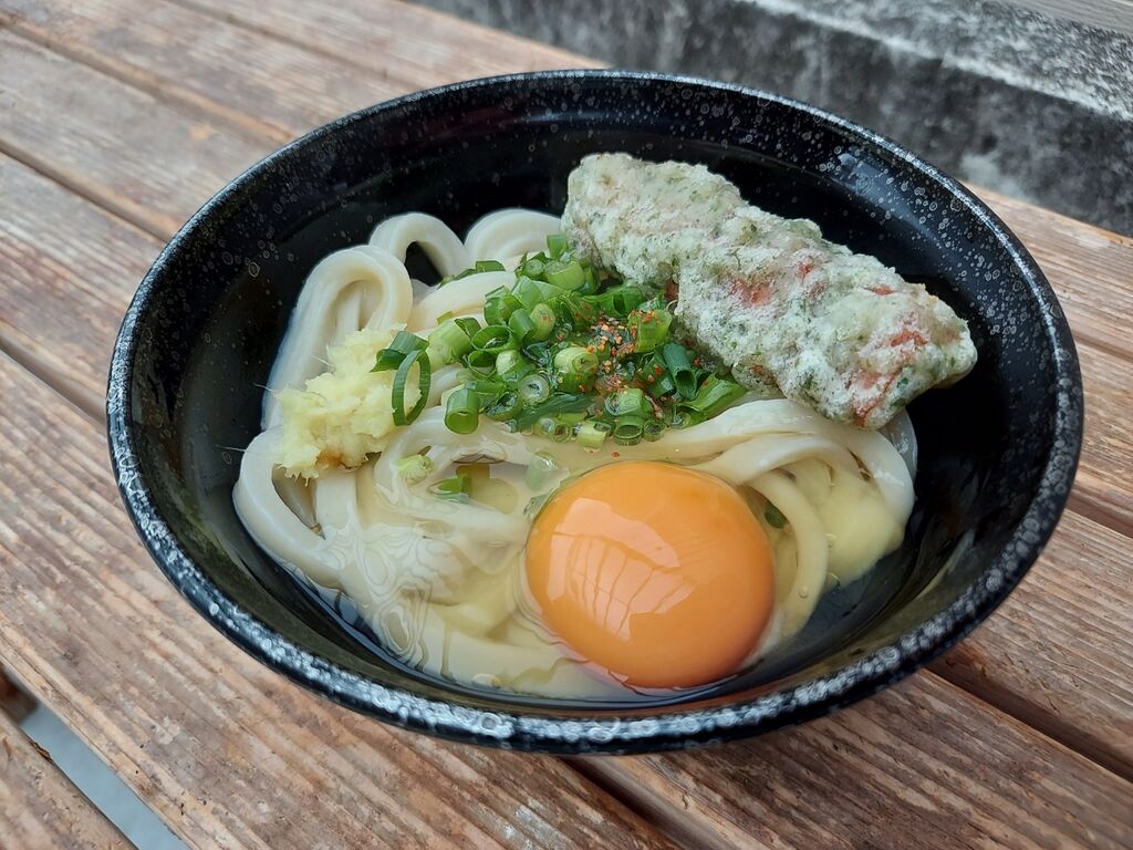 ルールが難しいですが、うどんを受け取り、自分でトッピング(玉子も割る)してお店のレジで会計です。