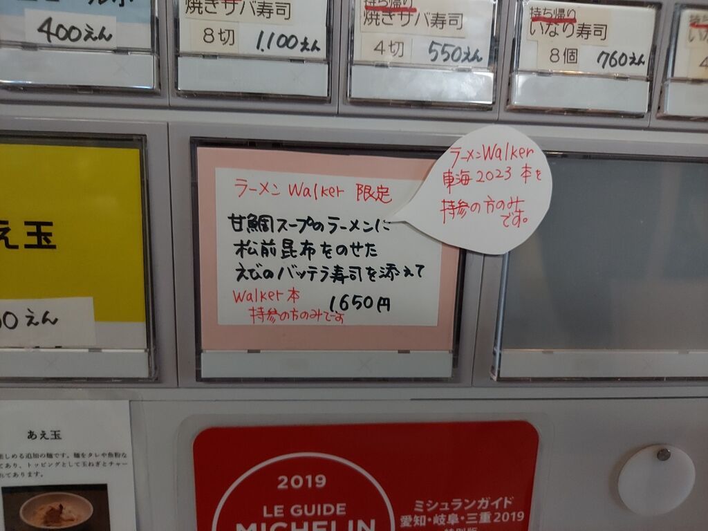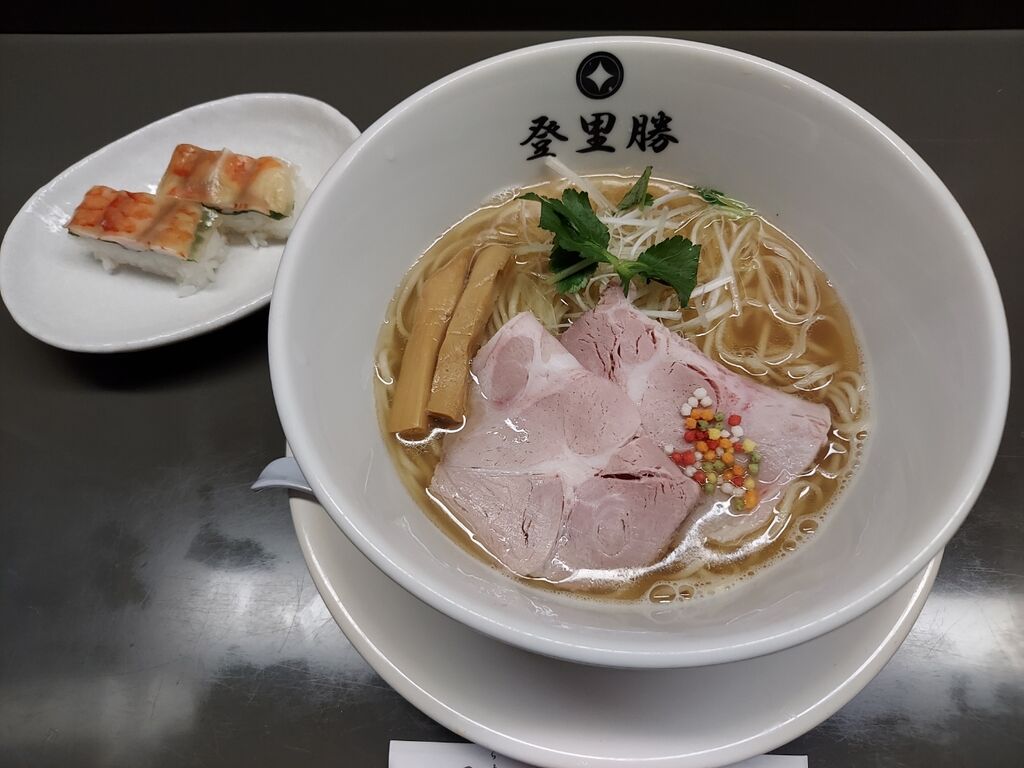 『甘鯛スープのらーめんに松前昆布をのせたえびのバッテラ寿司を添えて 1650円』です(長っ!!)