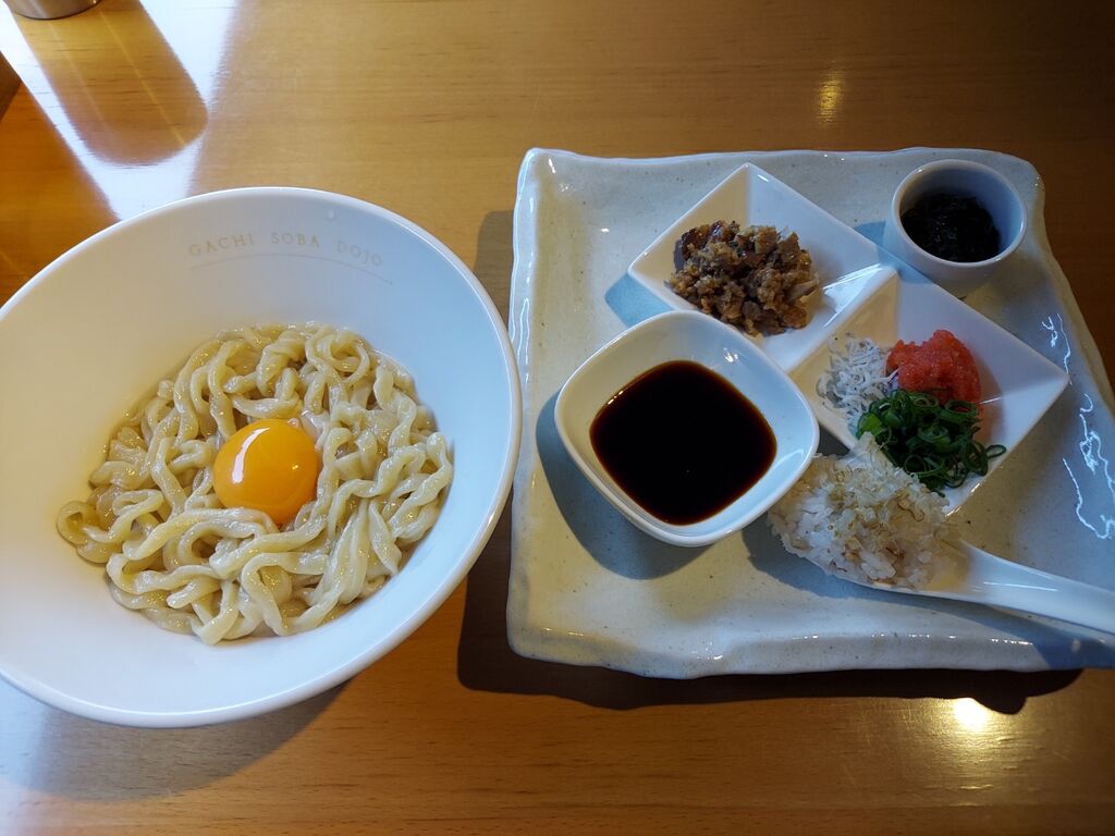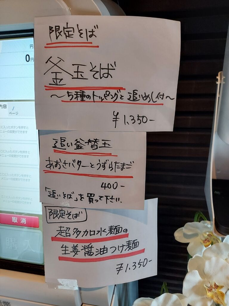 券売機で狙うは限定『釜玉そば~5種類のトッピングと追いめし付~ 1350円』