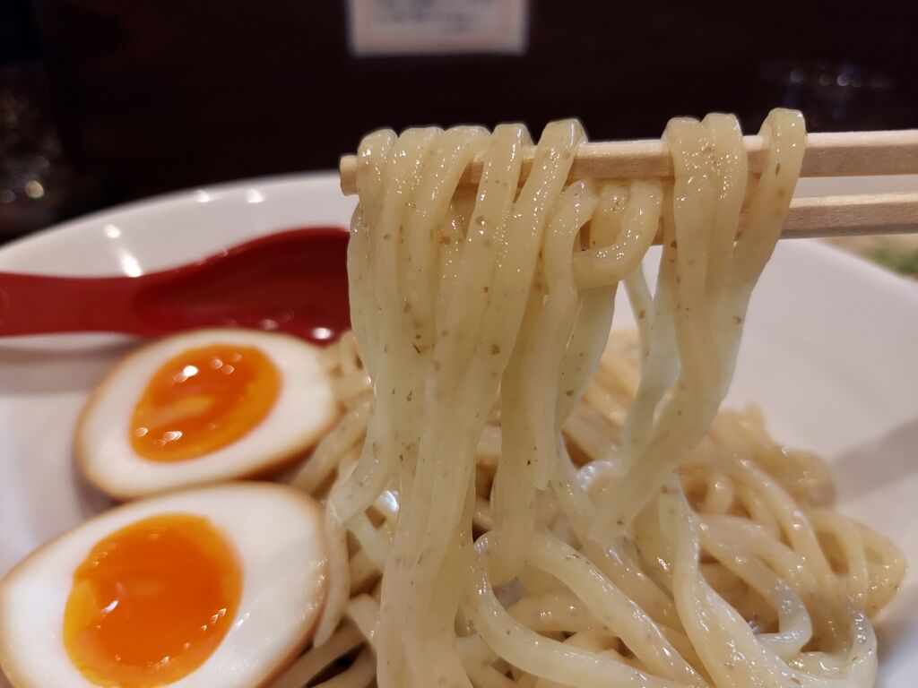 見た目から少しにゅめっとした麺はほぐしてリフトすると、加水の高さなのかみずみずしい艶と粒々で、すすると小麦の風味と歯応えがしっかりとして美味しい麺です🎵