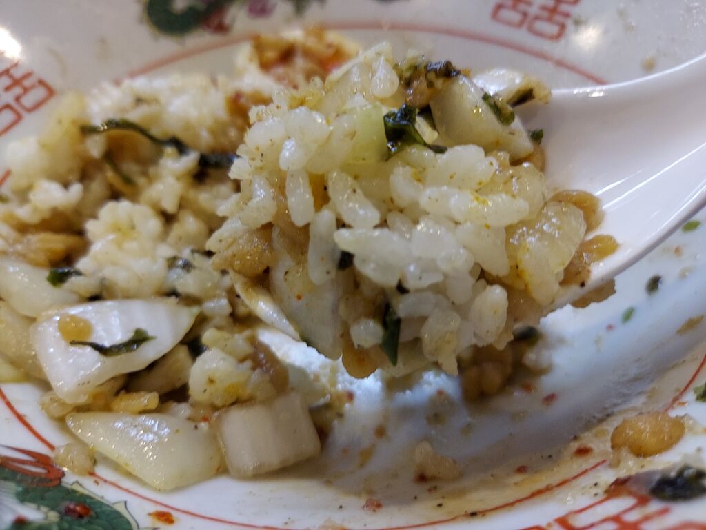 ヤッパリ大盛りにするべきやったかなぁ🎵と思いつつ、残ったカレー風味のタレ入り🍜に追い飯をほりこみます!!