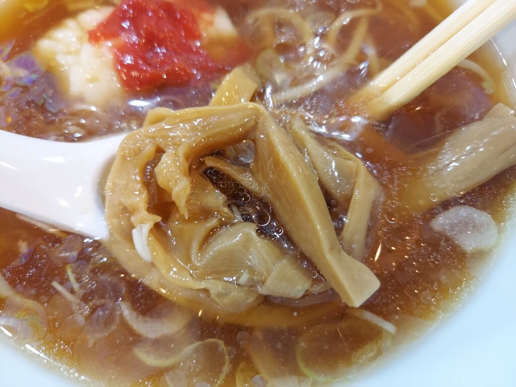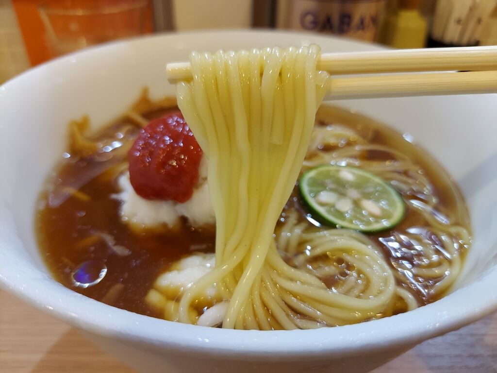 麺はやや細目の食感の良いツルっとした感じで、冷えたスープとの相性が良くすすりが止まりませんわ。