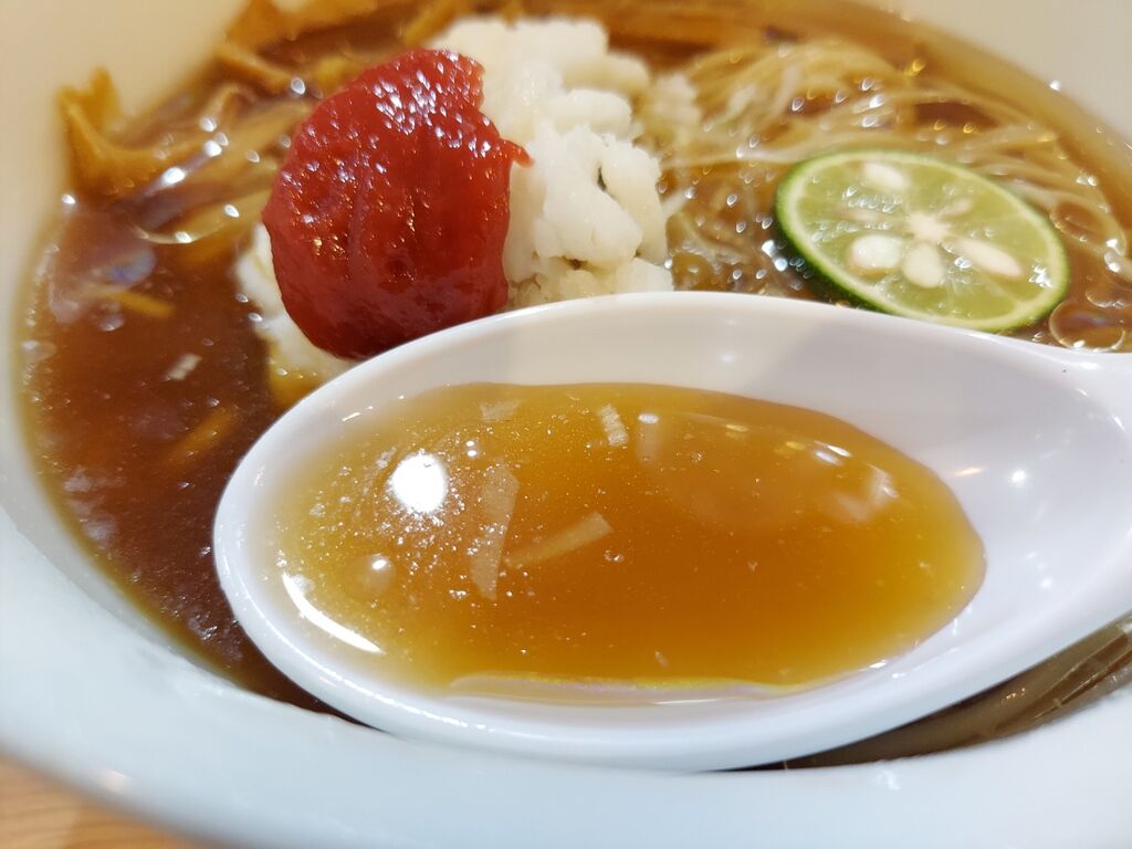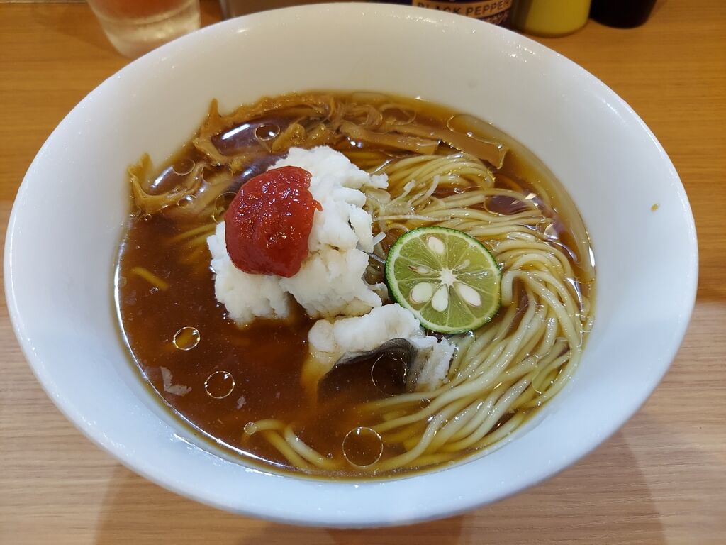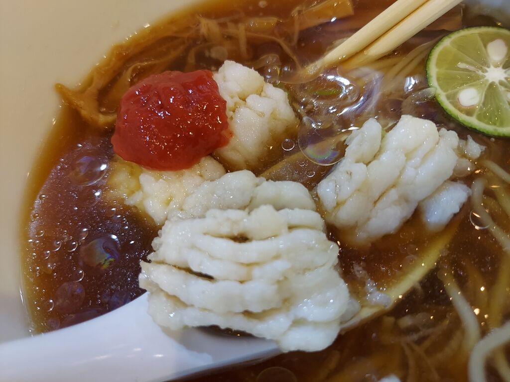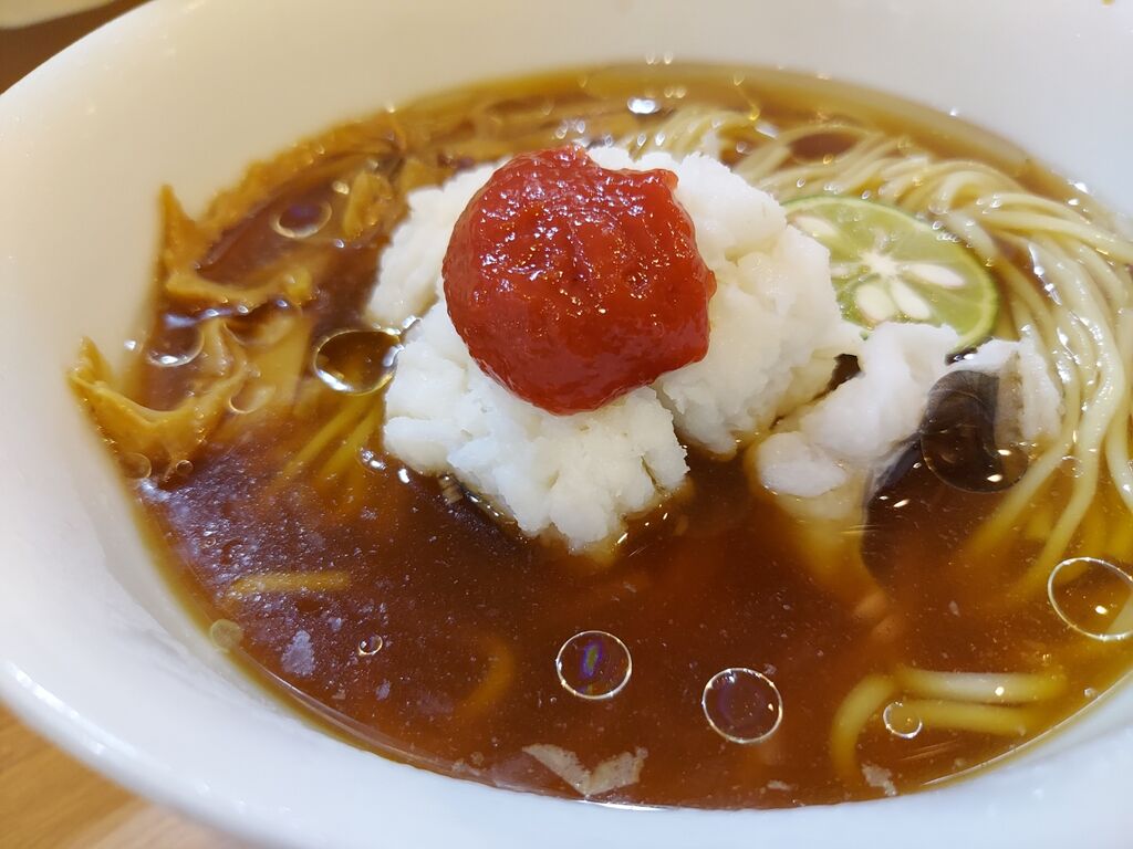 酸味がほんのりしてサッパリしている飲み口の良いスープですが鱧?の出汁がなかなかしっかりとしてます😀
