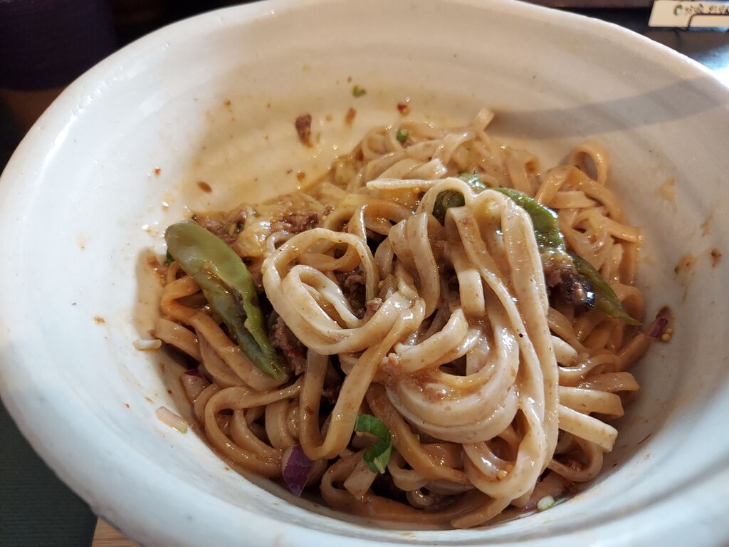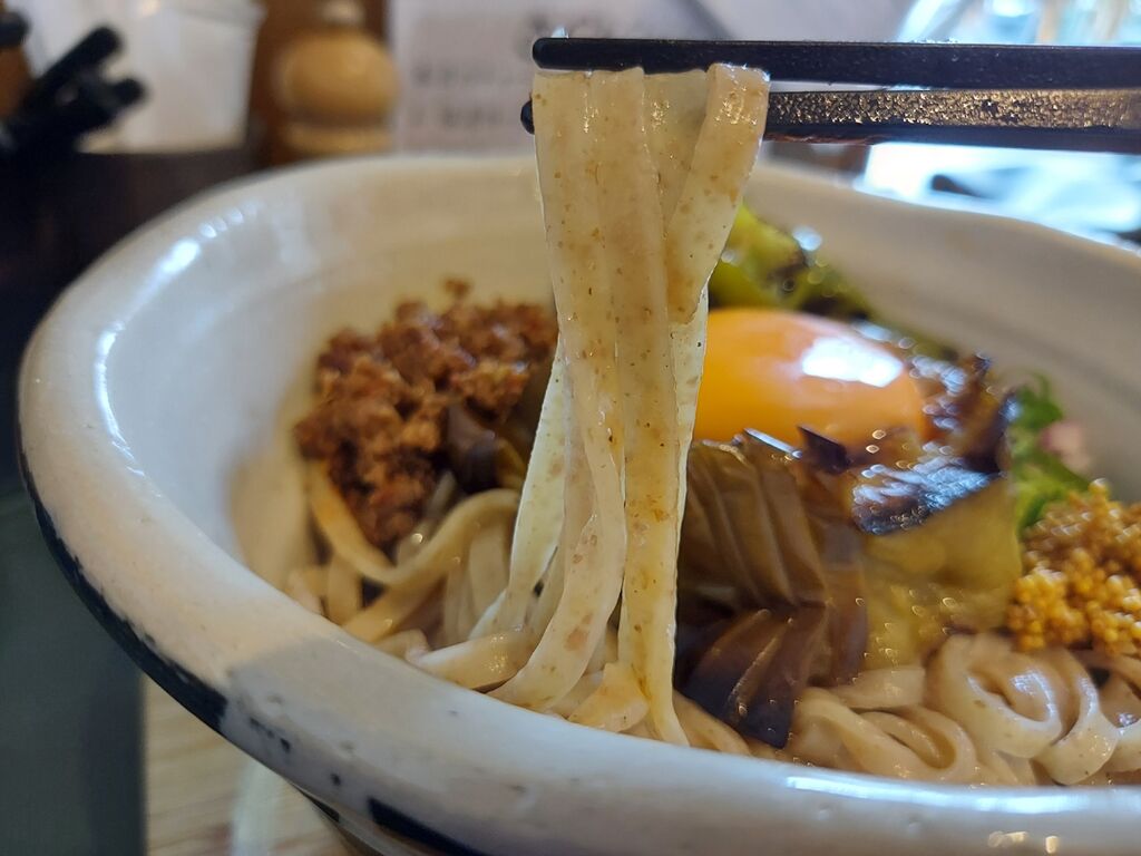 blogに玄麦から自家製粉した春よ恋全粒粉をたっぷり配合されてると書いてあったのですが、蕎麦色に色づいた平打ちの麺は見た目では想像できないしなやかな麺で、引っ張っても切れ無いほどでしたね~😗