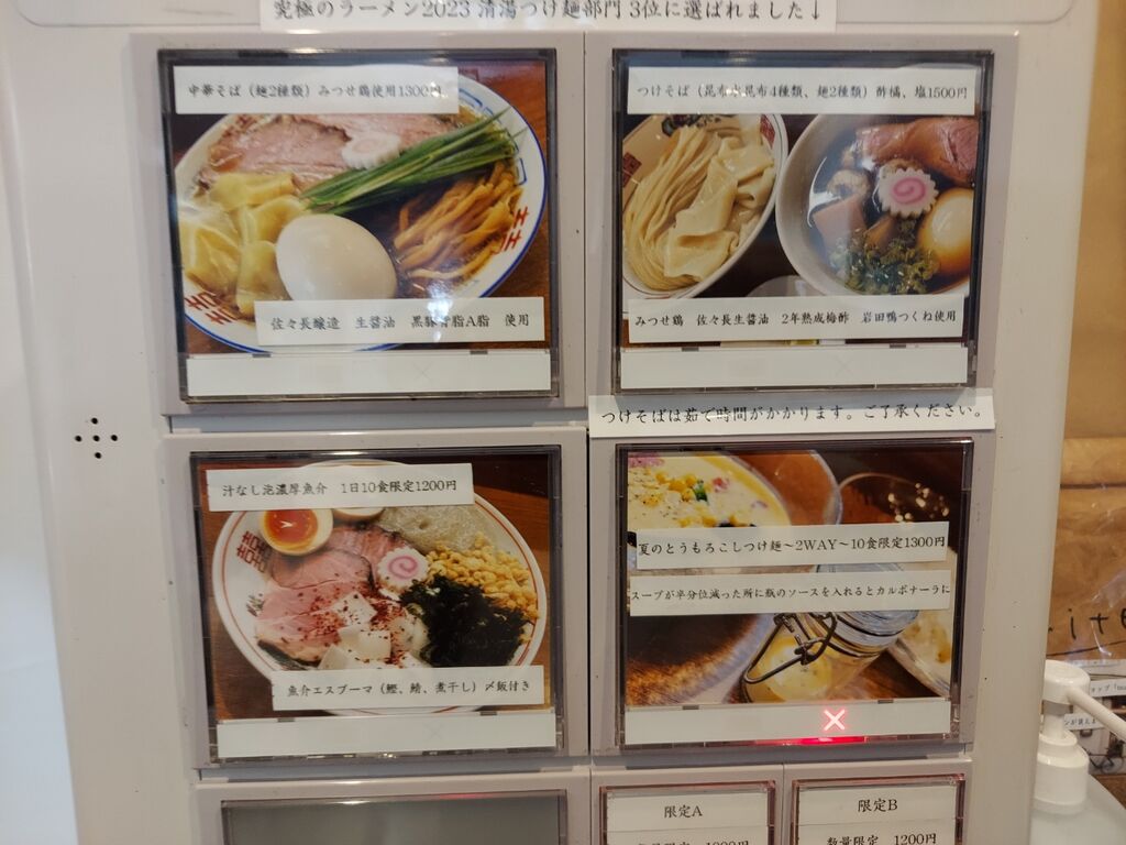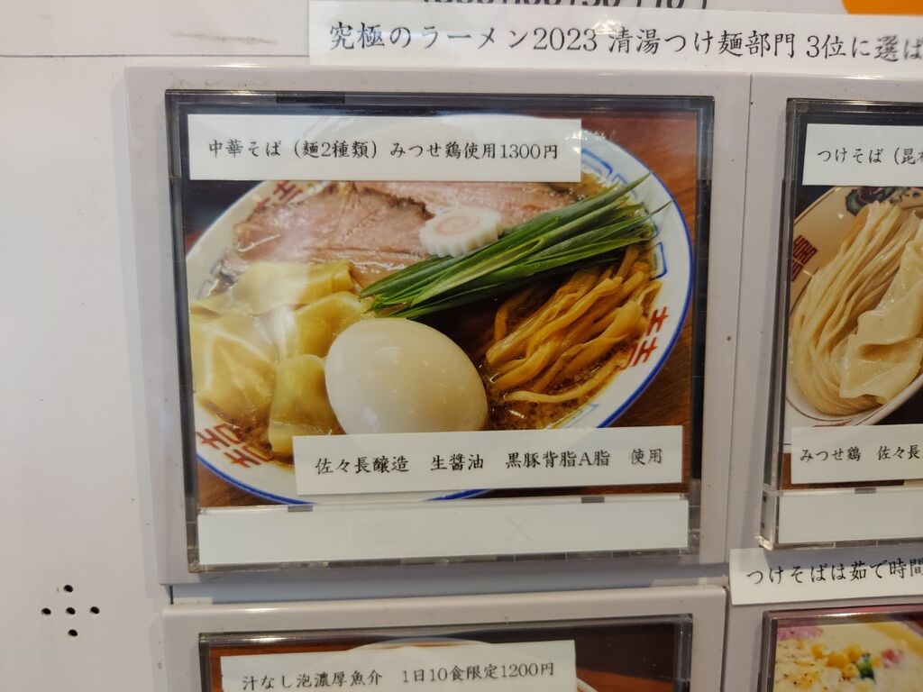 本日の券売機で押すは『中華そば (麺二種類)みつせ鶏使用 1300円』です。