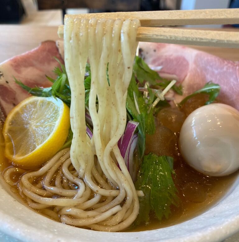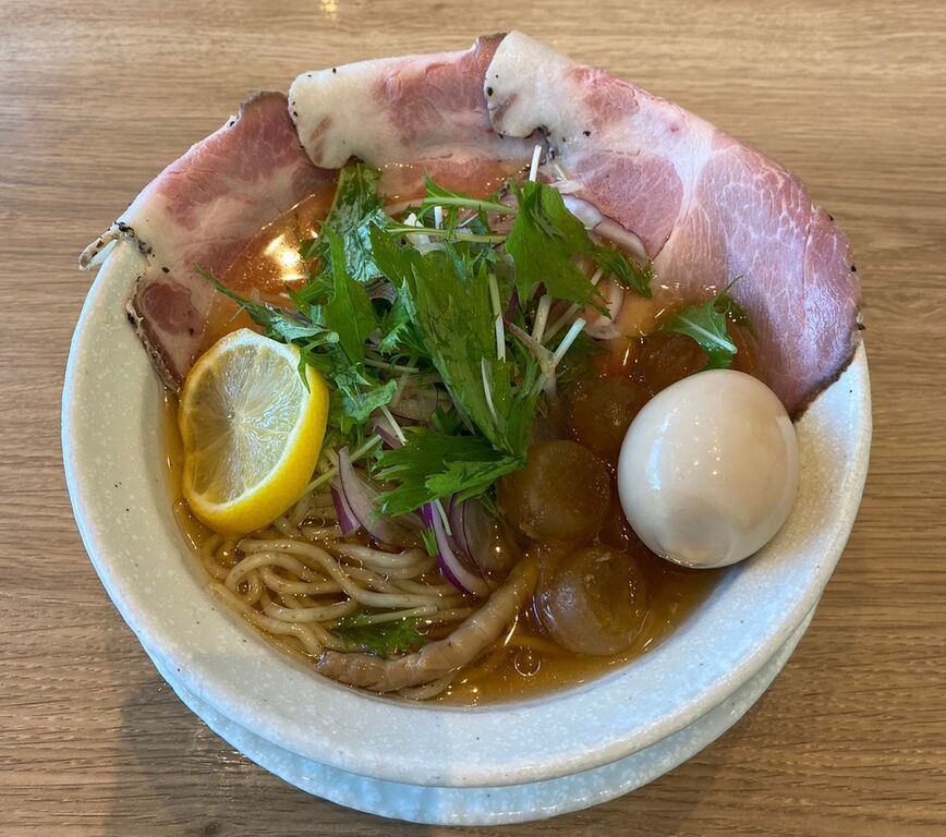 麺屋 聖~kiyo~南草津店【初】 2023年09月25日 Rating : 麺屋 聖~kiyo~南草津店@滋賀県 草津市★★★☆☆あちらこちらに展開する麺屋優光グループのお店。今日は冷やしを求めて訪問。🍜 冷やし淡竹 COLD HACHIKU 煮玉子着丼するとレモンに出汁氷と涼しげなビジュアル✨スープは貝出汁であっさり目で美味しいです。麺は全粒粉入りのツルシコ麺で啜り心地が素敵。チャーシューも大き目のレアチャにブラックペッパー効いてて美味しい。〆はレモンも絞ってあっさりといただきました。 「三重県」カテゴリの最新記事 < 前の記事次の記事 >