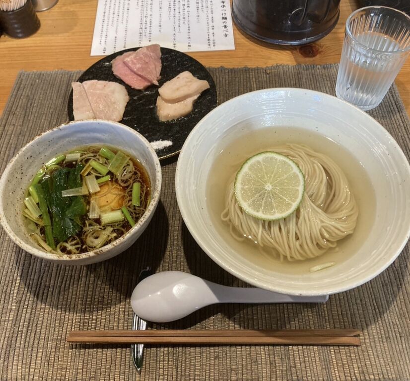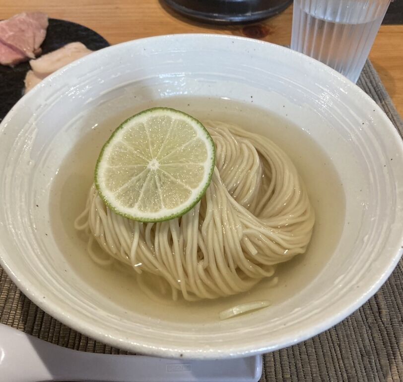 透明度高い昆布水に浸かったしっかりとしまった麺はザクッとした食感、見た目より歯応えがあります。