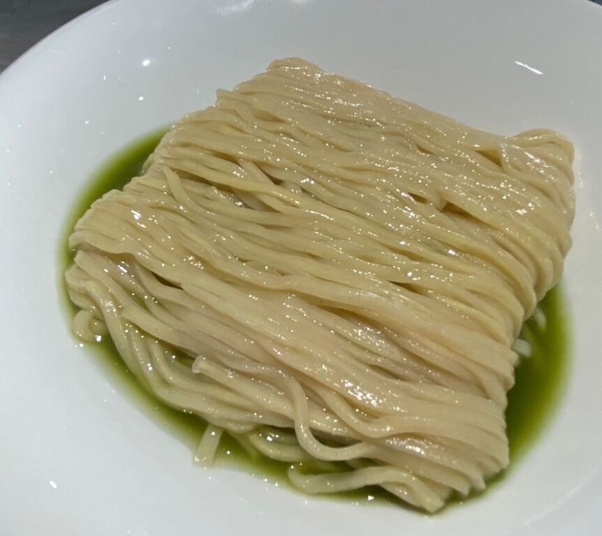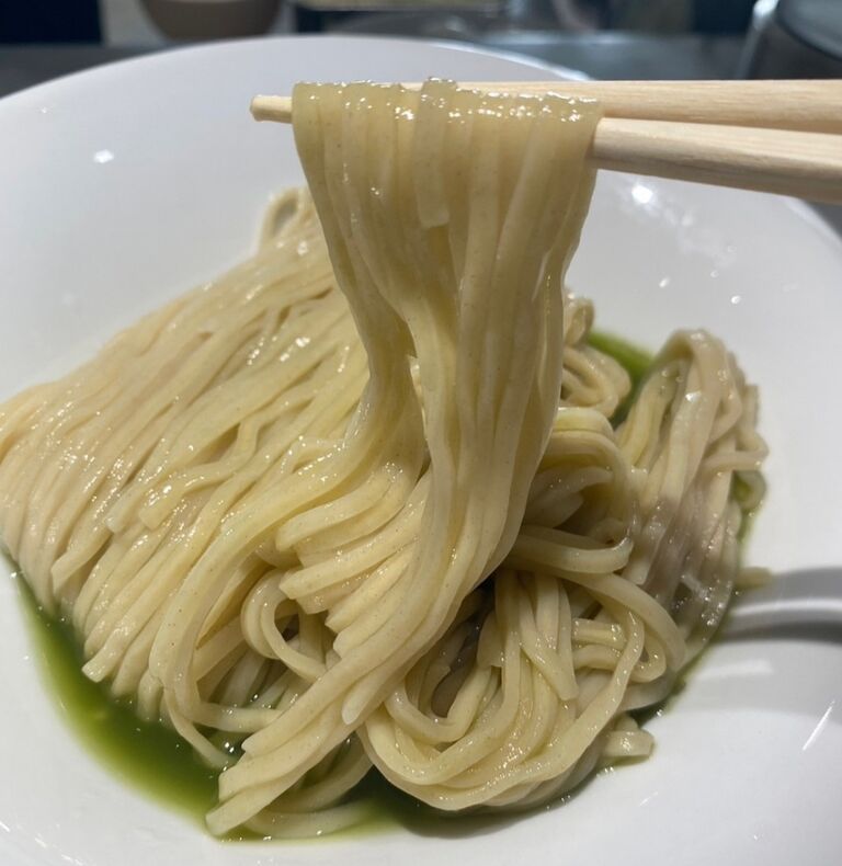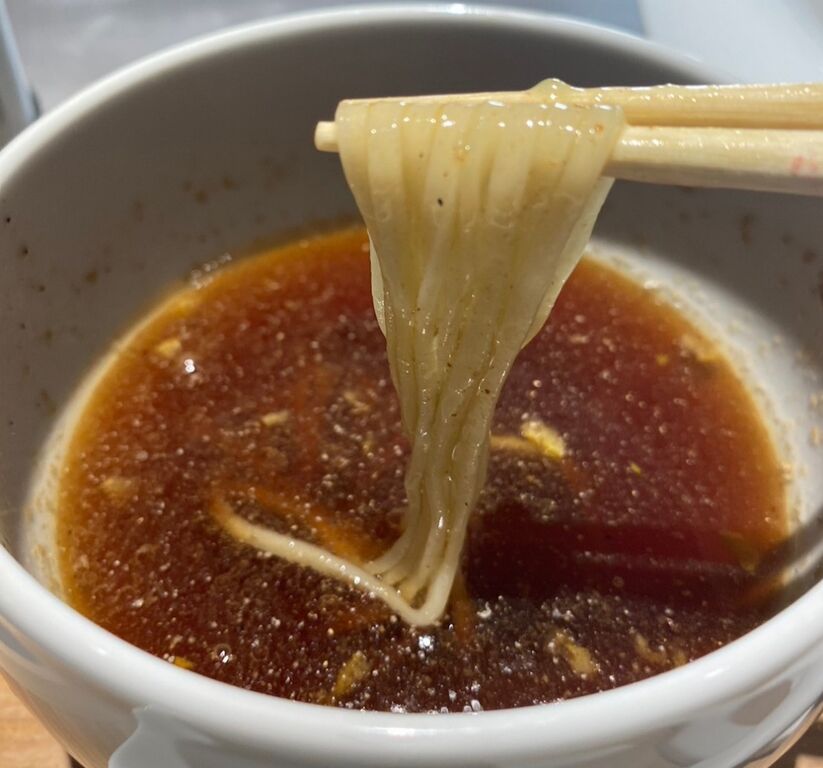まずは麺をいただきますが、平打ちストレートの麺はツルツル食感で啜り心地いい感じ!