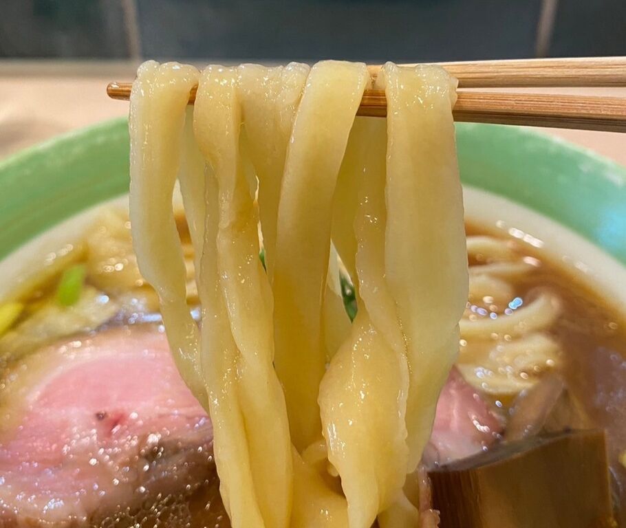 手打ちされたばかりの極太ピロピロ麺はコシがありツルツル✴️