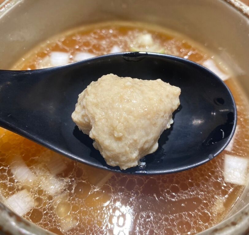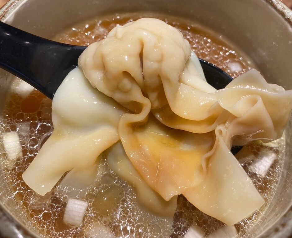 続いて醤油のつけ汁ですが、イメージとは少し違った濃すぎることの無いつけ汁で、中には肉団子、わんたん、帆立が入ったウマウマつけ汁。