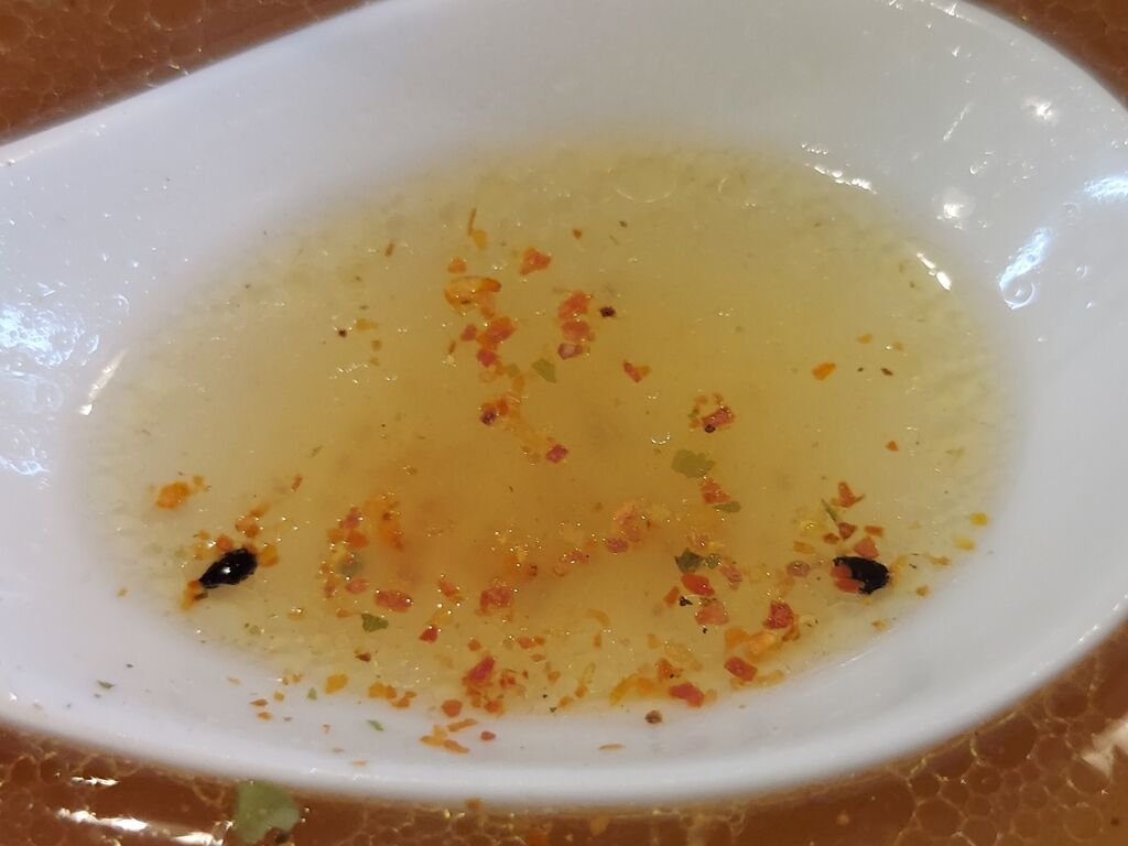 〆のスープは卓上の七味をパラリ。