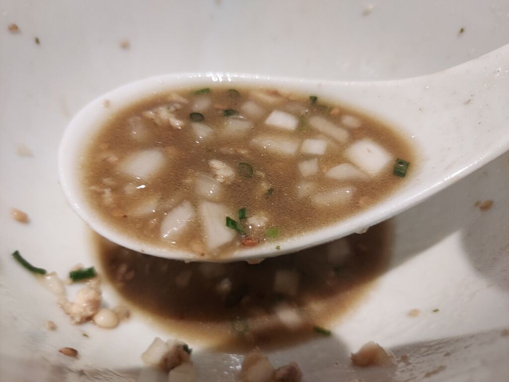 最後にスープを浸る程度に投入してズルズルっと食べますが麺も美味いけど、ミンチ&玉ねぎが混ざったスープがマジ最高!!