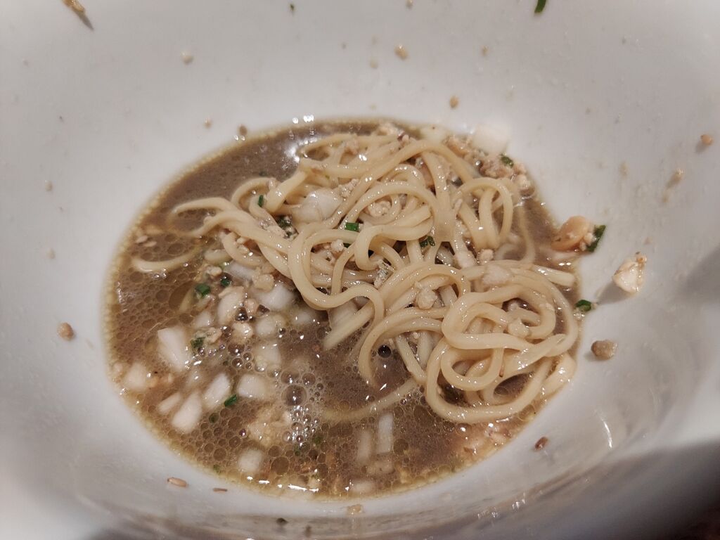 続いてつけ麺風にニボニボスープにスッとくぐらせて啜りますが、甘bitterな感じも悪くない!