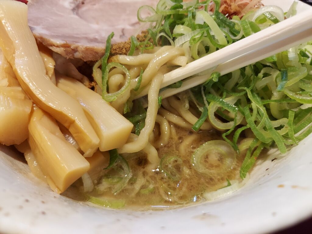 そして麺をズルズルっと啜りますが、ワシワシっとした麺は豚骨感より節の風味をしっかりと纏って口の中へ入ってきます。
