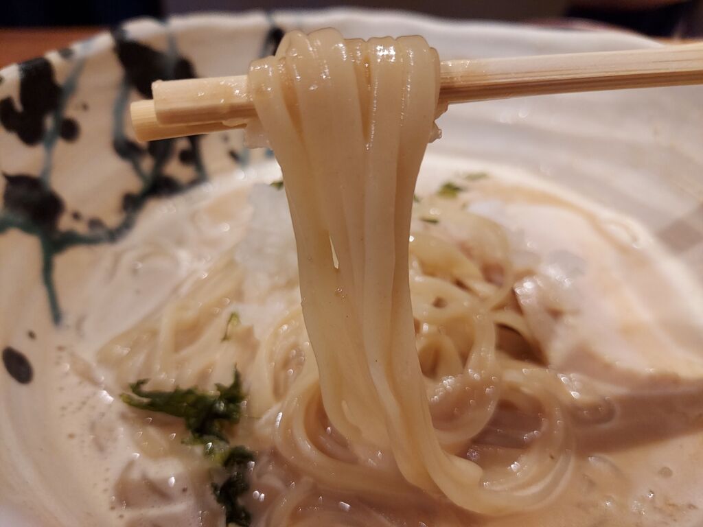 麺は平打ちなツルツルの麺でメチャクチャ啜れますわ。