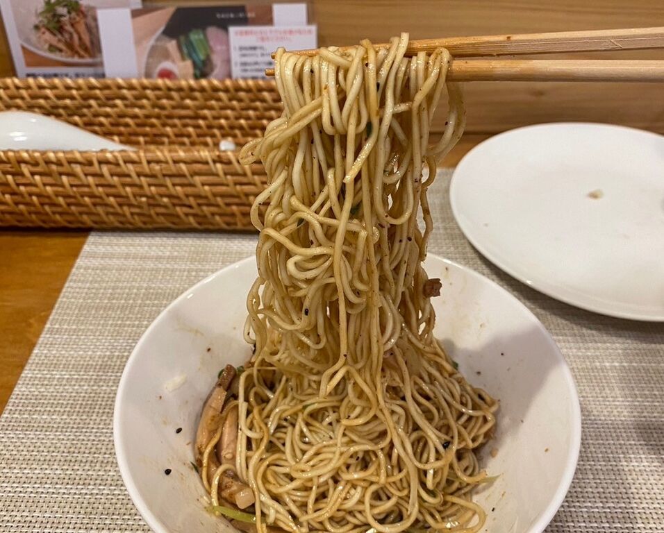 まずはONLY麺で啜りますが、細めのパツ麺は、しっかりほぐさないとなかなか適量がとれません😛