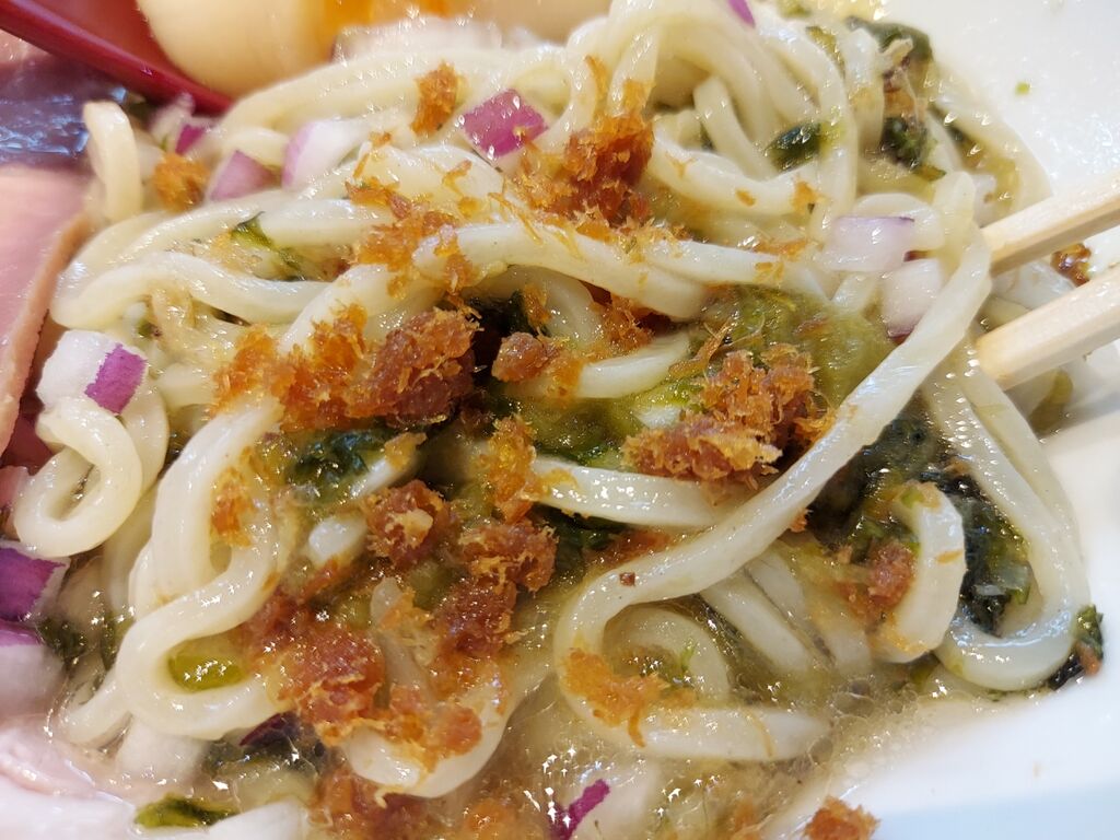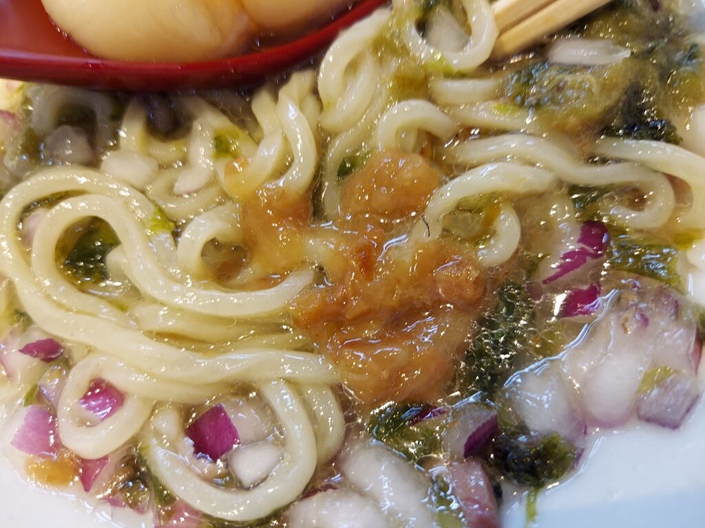 序盤を麺で楽しんだら、中盤に入る前には昆布、海苔、オニオン、節をグリグリまぜて啜ります。