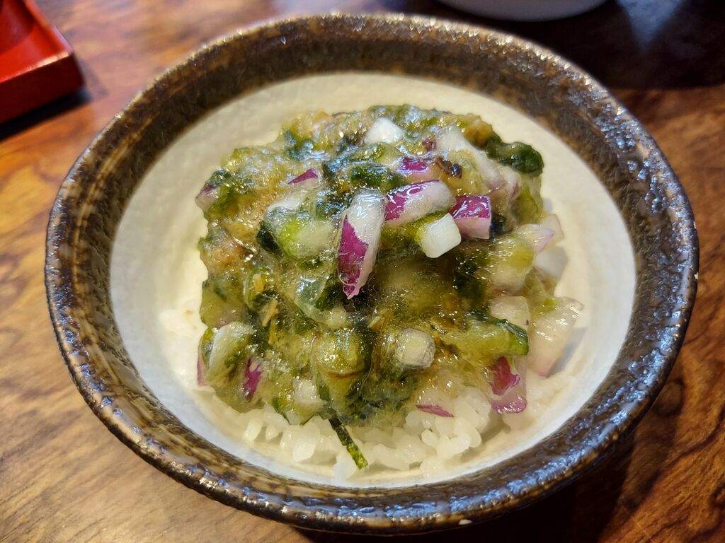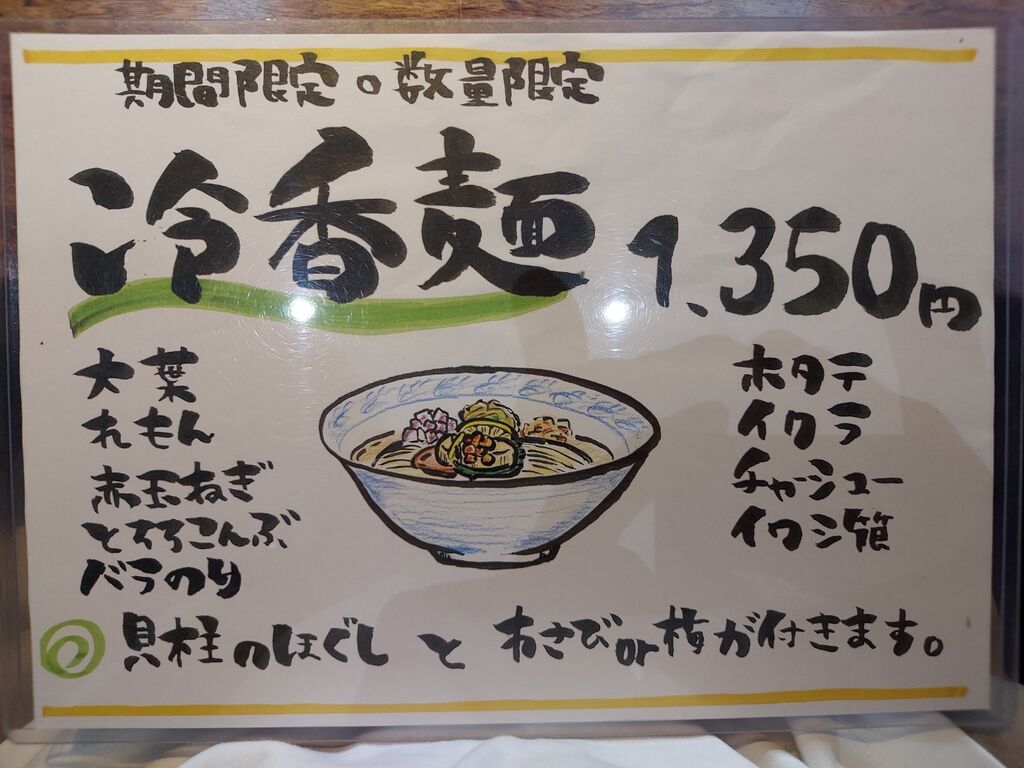 海のあとはお腹ペコペコなので、期間限定・数量限定の『冷香麺(梅) 1350円』に本日は『お茶漬け用ごはん(ワサビ) 150円』です。