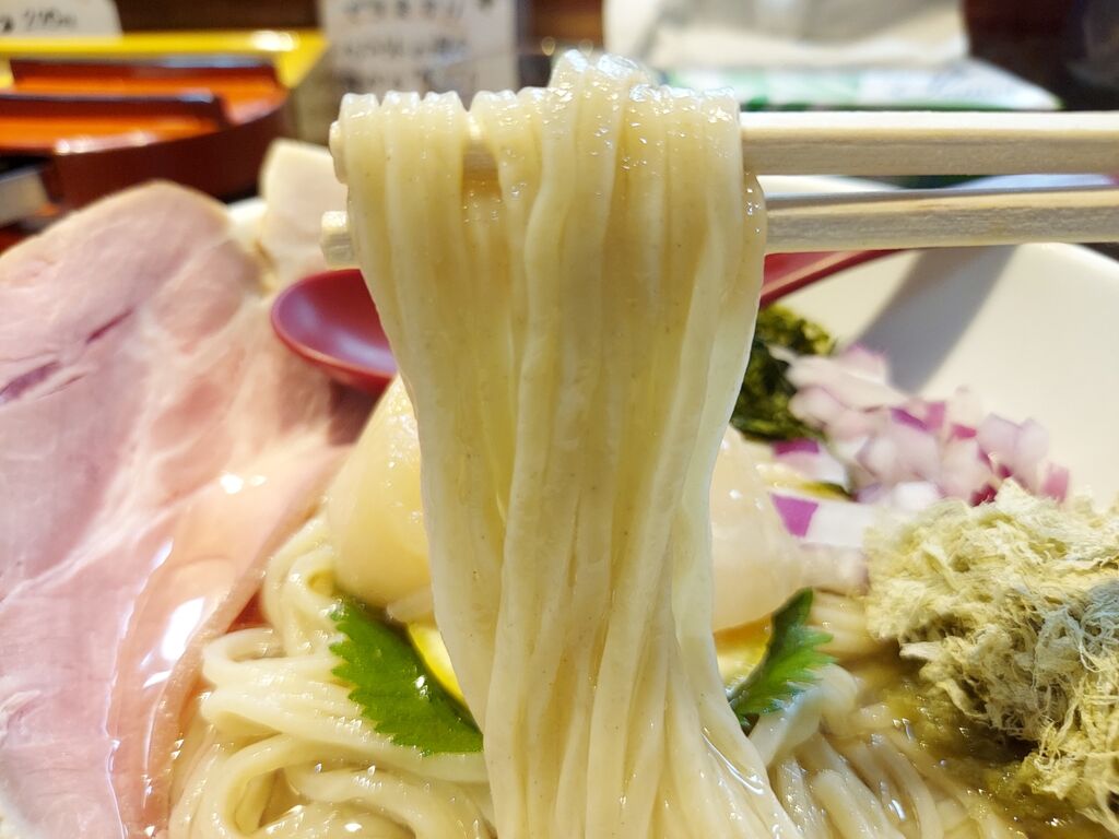 ムッチリした麺に少し見とれつつ、ズルズルっとすすりますが、本日の一口目は小麦この麺の食感はやはり県内では貴重です😀メチャイイヨネ