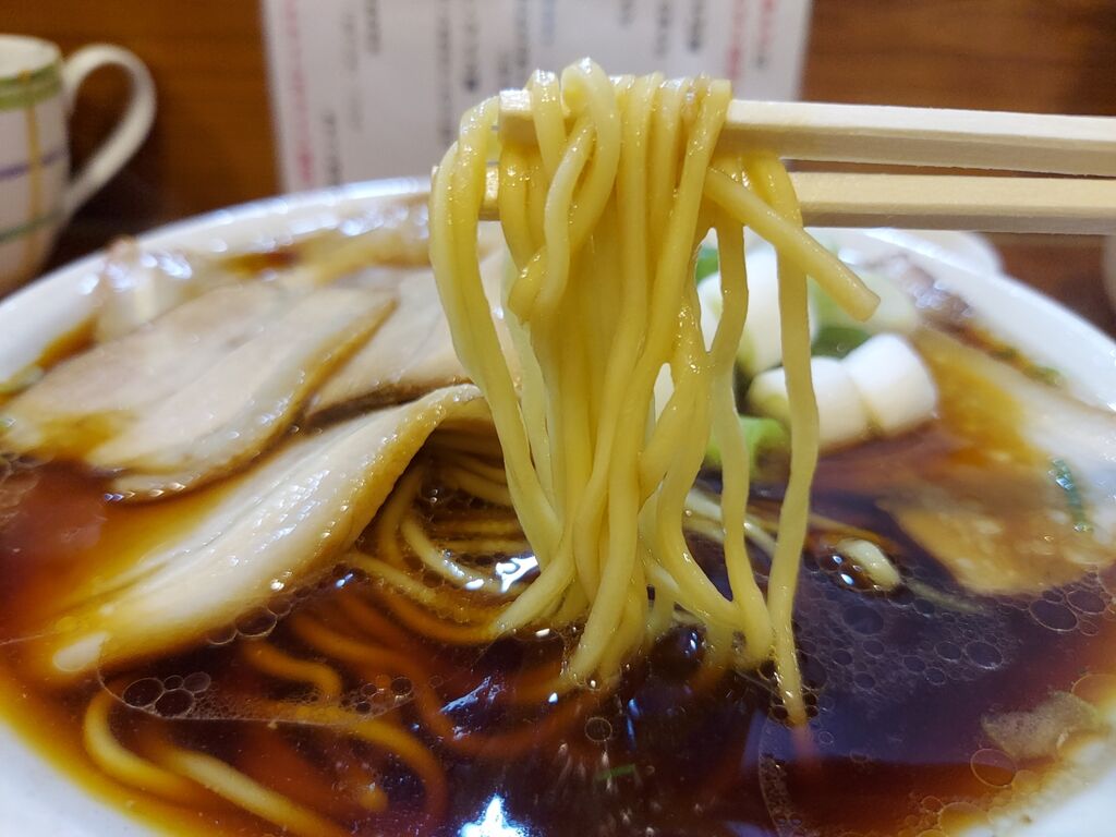微かにたまりのスープ色に染まった麺は歯切れ良くて美味しいですわ。