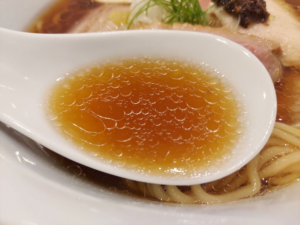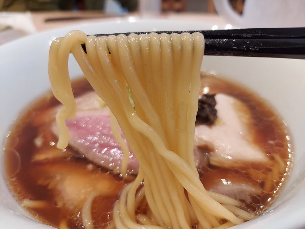 鶏ベースのスープは煮干し、昆布、あさり、キノコ類などのスープと解説されていますが、トリュフが薫る中、まず感じたのは貝出汁!!