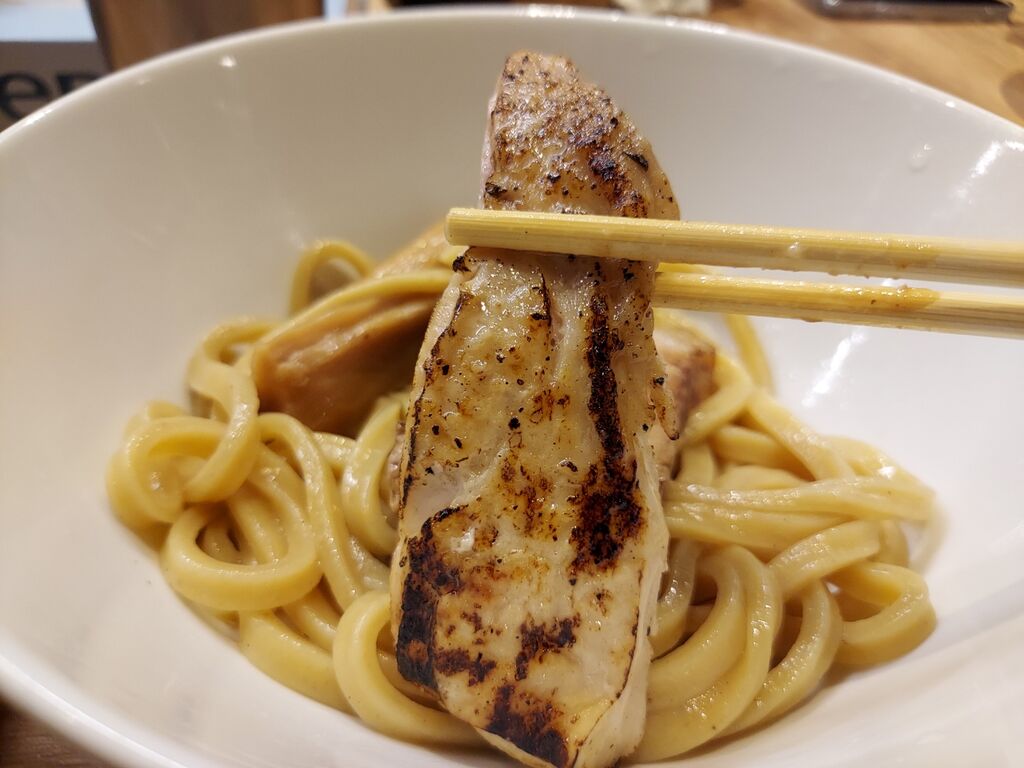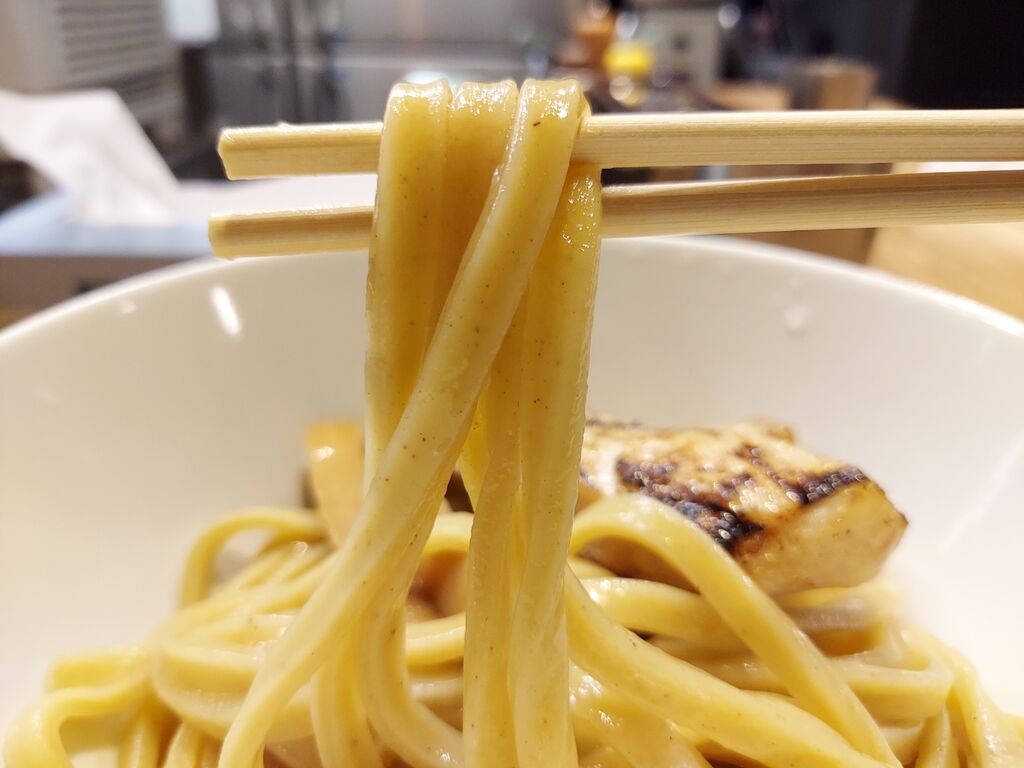 続いて麺をそのままチュルりといきますが、太いけどしっかり芯まで茹ってて小麦の風味抜群!
