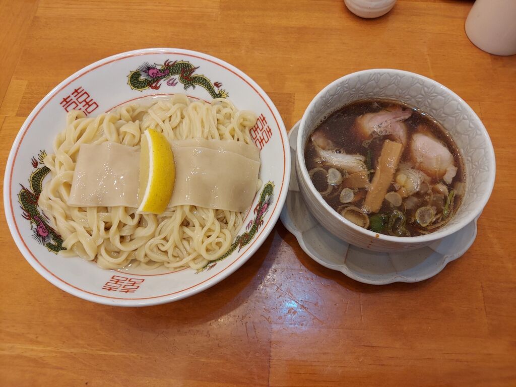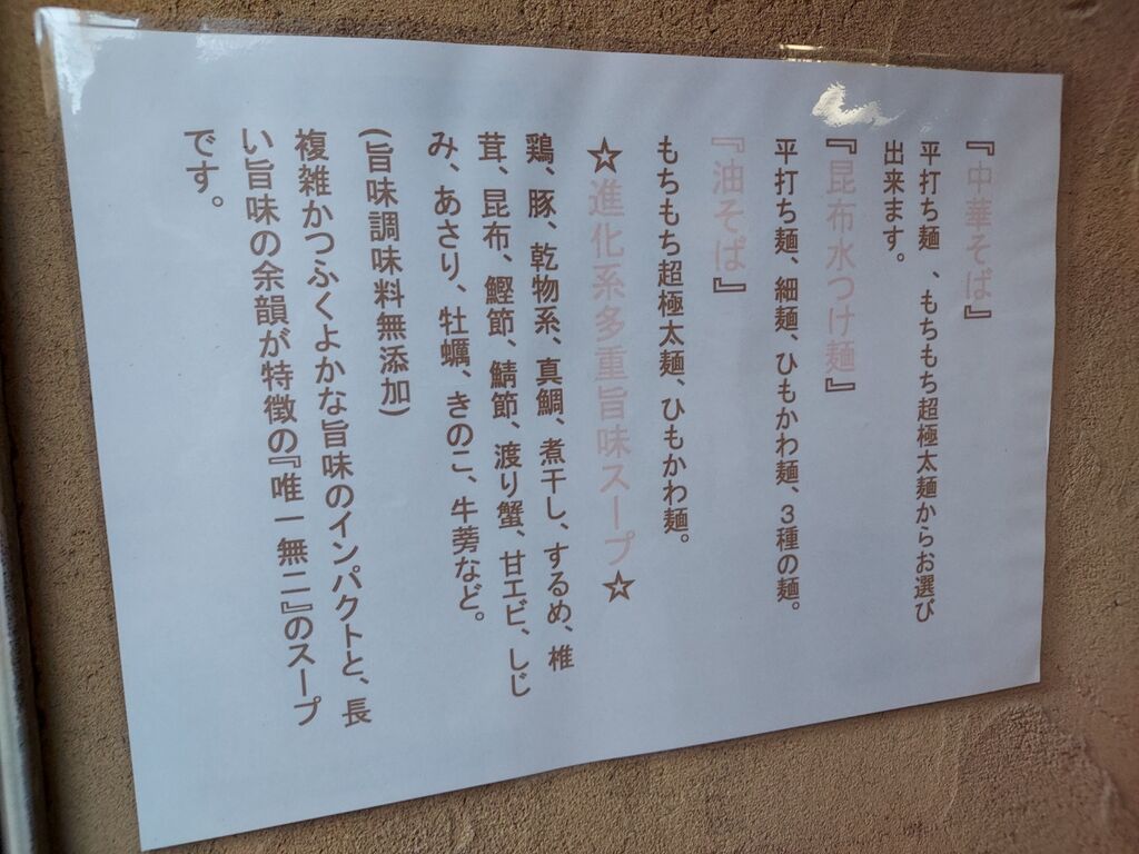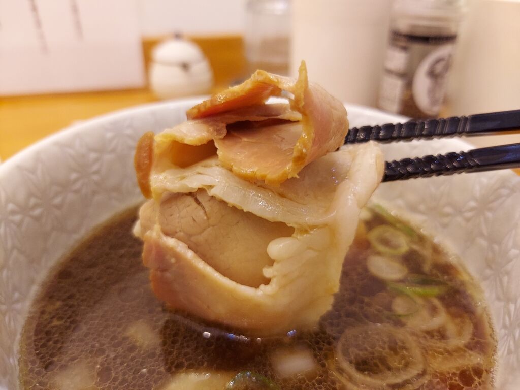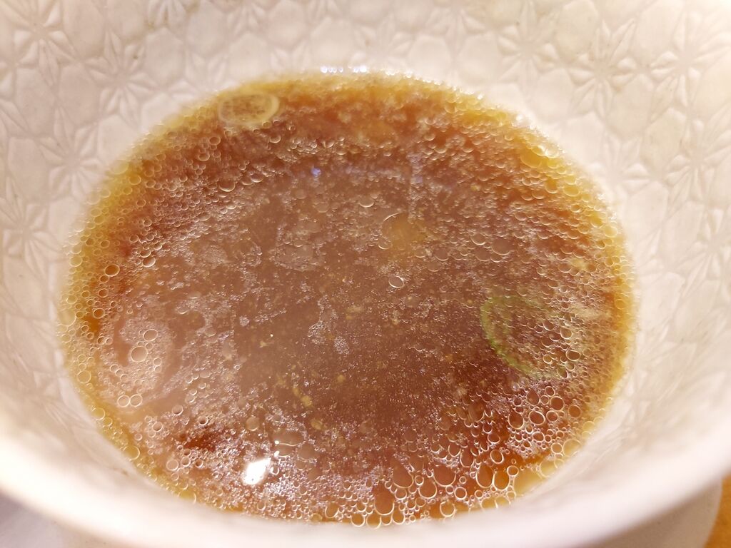 鶏、豚、真鯛、煮干し、するめ、椎茸、昆布、鰹節、鯖節、渡り蟹、甘エビ、しじみ、あさり、牡蠣、きのこ、牛蒡と解説がありますが、動物系ベースのつけ汁はドン!とタレが強めで濃厚な味わい。