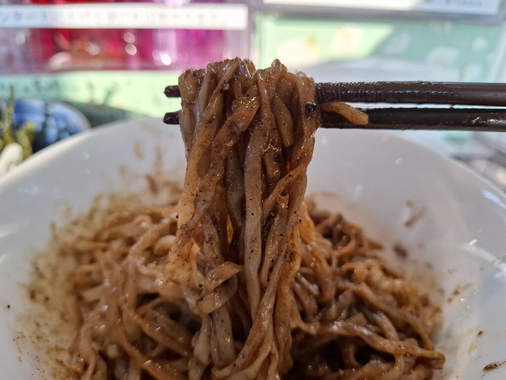 まだらな混ざりを楽しもうと、早めに麺をリフトしてズルズルっと啜ります。