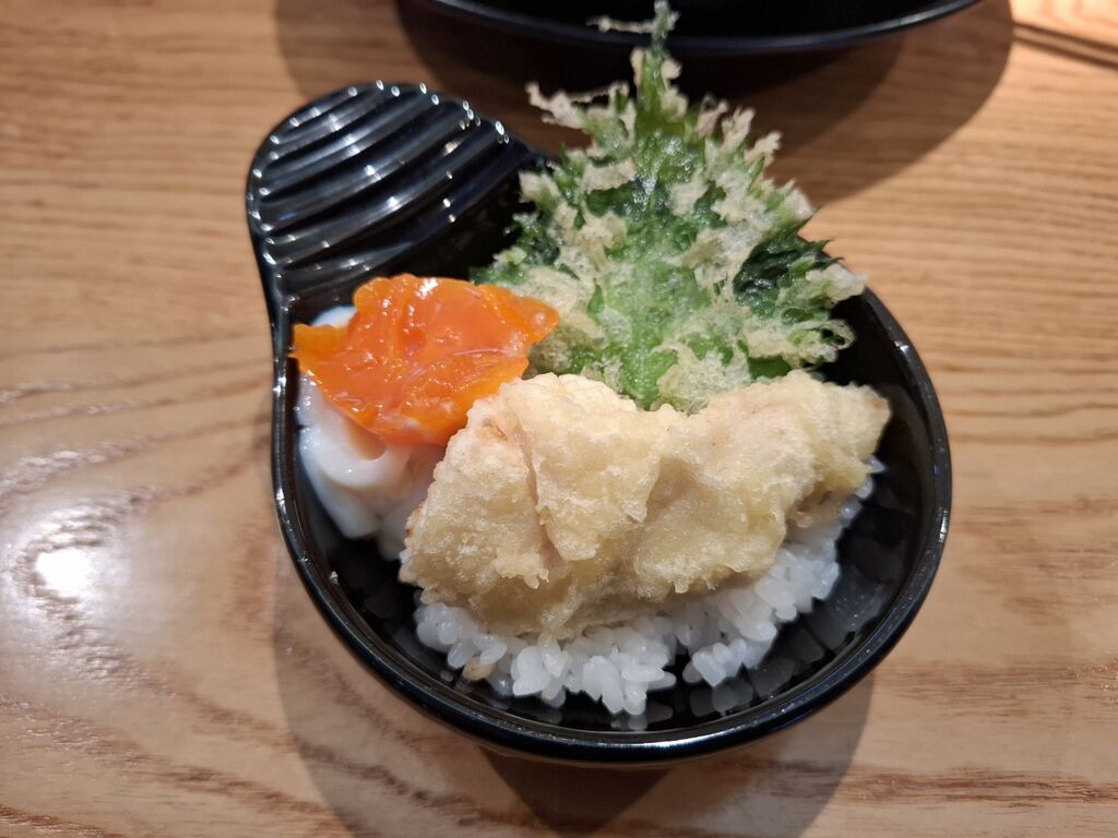 鶏天をもりっと食べたら、残ったご飯に冷香麺の旨味を投入して、パリパリの天ぷらをモシャモシャといただきました。