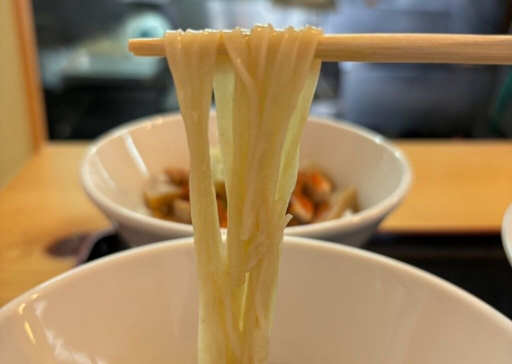 まずはお出汁に浸かった平打ち麺をオンリー麺でいただきます🍜
