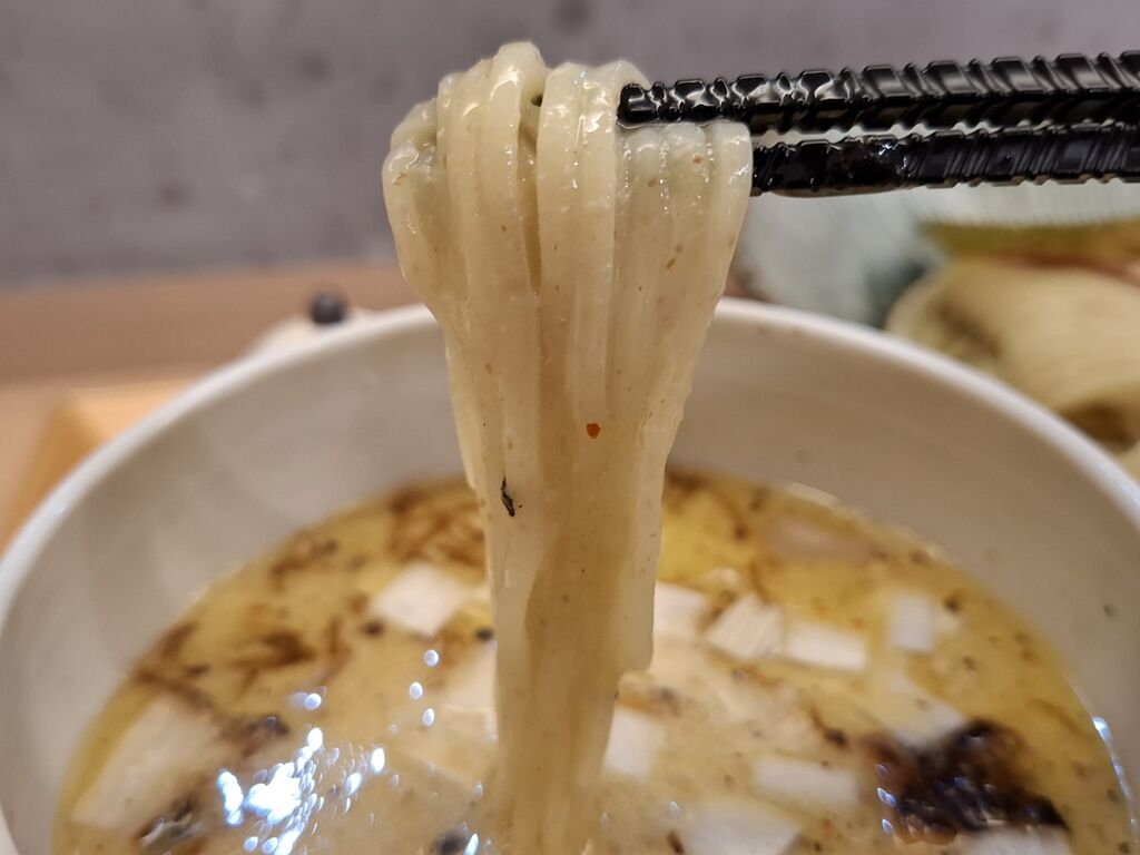 しっかりとしまった粒々入りの麺は弾力系。