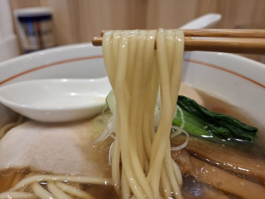 続いて麺をリフトしますが、ちょい太目のストレート麺は、かなりモッチリとした食感でしっかりとスープを絡みつけて口まで運んでくれるので、バッチぐーな相性です。