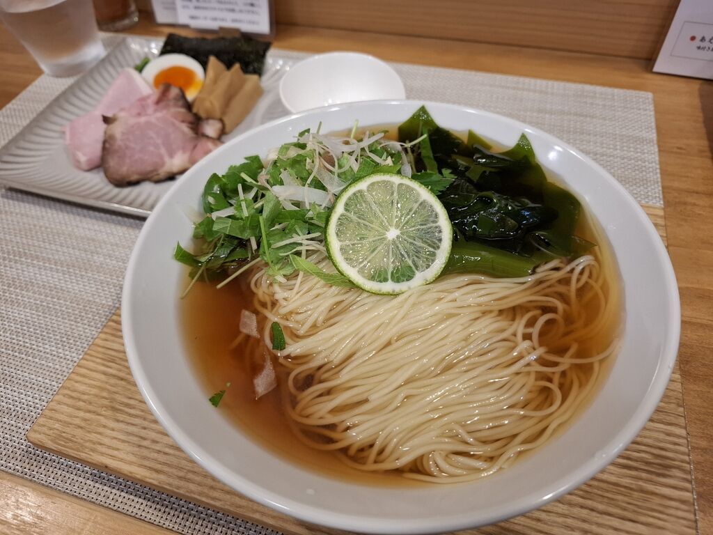 ワカメに加え、茗荷、新しょうが、青紫蘇、淡路産ホワイトパールオニオンをバランス良く合わせた物をたっぷりあしらった、冷たいラーメンとの事ですが、麺の半分は薬味、半分はスープから麺が見えてて美味そう🤤